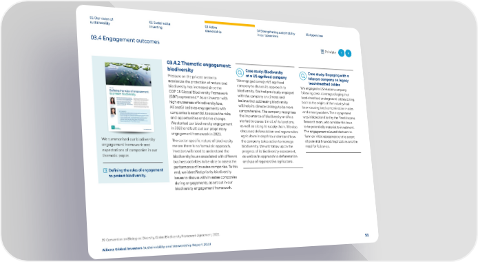01 Our vision of 02 Sustainable 03 Active 04 Strengthening sustainability 05 Appendices sustainability investing stewardship in our operations 03.4 Engagement outcomes Principle 7 9 03.4.2 Thematic engagement: Case study: Biodiversity Case study: Engaging with a biodiversity at a US agrifood company telecom company on legacy Pressure on the private sector to We engaged a major US agrifood lead-sheathed cables accelerate the protection of nature and company to discuss its approach to We engaged a US telecom company biodiversity has increased since the biodiversity. We had previously engaged following press coverage alleging that COP 15 Global Biodiversity Framework with the company on climate and lead-sheathed underground cables dating 39 (GBF) agreement. As an investor with believe that addressing biodiversity back to the origins of the industry had high awareness of biodiversity loss, will help its climate strategy to be more been causing lead contamination in sites AllianzGI believes engagements with comprehensive. The company recognises and among workers. The engagement companies is essential to scope the risks the importance of biodiversity and has was initiated and led by the Fixed Income and opportunities and drive change. started to assess it in all of its locations, Research team, who consider this issue We started our biodiversity engagement as well as along its supply chain. We also to be potentially material to investment. in 2022 and built out our proprietary discussed deforestation and regenerative The engagement allowed the team to engagement framework in 2023. agriculture in depth to understand how form an initial assessment on the extent We summarised our biodiversity The sector-speci昀椀c nature of biodiversity the company takes action to manage of potential 昀椀nancial implications and the engagement framework and means there is no formulaic approach. biodiversity. We will follow up on the need for follow-up. expectations of companies in our Investors will need to understand the progress of its biodiversity assessment, thematic paper. biodiversity issues associated with di昀昀erent as well as its approach to deforestation business activities to be able to assess the and use of regenerative agriculture. De昀椀ning the rules of engagement performance of investee companies. To this to protect biodiversity. end, we identi昀椀ed priority biodiversity issues to discuss with investee companies during engagements, as set out in our biodiversity engagement framework. 39 Convention on Biological Diversity, Global Biodiversity Framework Agreement, 2022. Allianz Global Investors Sustainability and Stewardship Report 2023 51