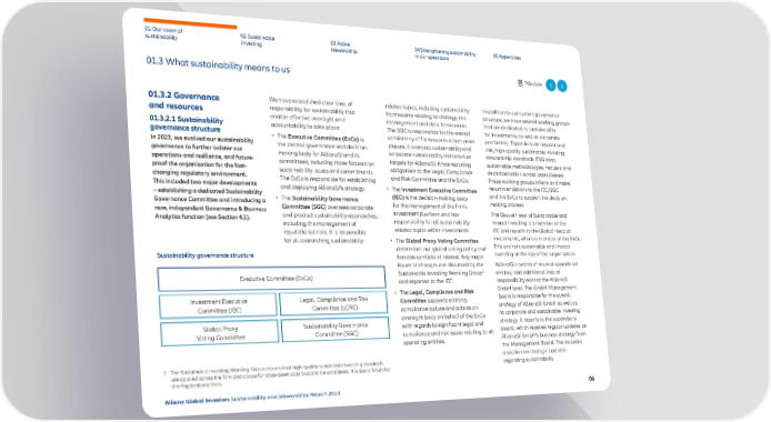 01 Our vision of 02 Sustainable 03 Active 04 Strengthening sustainability 05 Appendices sustainability investing stewardship in our operations Principle 1 2 01.3 What sustainability means to us 01.3.2 Governance We have established clear lines of related topics, including sustainability In addition to our current governance and resources responsibility for sustainability that frameworks relating to strategy, risk structure, we have several working groups enable e昀昀ective oversight and management and data frameworks. that are dedicated to sustainability 01.3.2.1 Sustainability accountability to take place: The SGC is responsible for the overall for investments, as well as corporate governance structure • The Executive Committee (ExCo) is consistency of frameworks across asset positioning. Topics include reputational In 2023, we evolved our sustainability the central governance and decision- classes. It oversees sustainability and risk, high-quality sustainable investing, governance to further bolster our making body for AllianzGI and its corporate sustainability indicators as stewardship standards, ESG data, operations and resilience, and future- committees, including those focused on targets for AllianzGI. It has reporting sustainable methodologies, net zero and proof the organisation for the fast- sustainability issues and commitments. obligations to the Legal, Compliance decarbonisation across asset classes. changing regulatory environment. The ExCo is responsible for establishing and Risk Committee and the ExCo. These working groups inform and make This included two major developments and deploying AllianzGI’s strategy. • The Investment Executive Committee recommendations to the IEC/SGC –establishing a dedicated Sustainability • The Sustainability Governance (IEC) is the decision-making body and the ExCo to support the decision- Governance Committee and introducing a Committee (SGC) oversees corporate for the management of the firm’s making process. new, independent Governance & Business and product sustainability approaches, investment platform and has The Global Head of Sustainable and Analytics function (see Section 4.3). including the management of responsibility for all sustainability- Impact Investing is a member of the reputational risks. It is responsible related topics within investments. IEC and reports to the Global Head of for all overarching sustainability- • The Global Proxy Voting Committee Investments, who is a member of the ExCo. determines our global voting policy and This anchors sustainable and impact Sustainability governance structure handles conflicts of interest. Any major investing at the top of the organisation. issues or changes are discussed by the AllianzGI consists of several operational 2 entities, and additional lines of Executive Committee (ExCo) Sustainable Investing Working Group and reported to the IEC. responsibility exist at the AllianzGI • The Legal, Compliance and Risk GmbH level. The GmbH Management Investment Executive Legal, Compliance and Risk Committee supports a strong Board is responsible for the overall Committee (IEC) Committee (LCRC) compliance culture and acts as an strategy of AllianzGI GmbH as well as oversight body on behalf of the ExCo its corporate and sustainable investing Global Proxy Sustainability Governance with regards to significant legal and strategy. It reports to the supervisory Voting Committee Committee (SGC) compliance and risk issues relating to all board, which receives regular updates on operating entities. AllianzGI GmbH’s business strategy from the Management Board. This includes a section on strategic updates 2 The Sustainable Investing Working Group ensures that high-quality sustainable investing standards regarding sustainability. are applied across the 昀椀rm and allows for cross-asset class topics to be considered. It is also a forum for sharing best practices. Allianz Global Investors Sustainability and Stewardship Report 2023 06