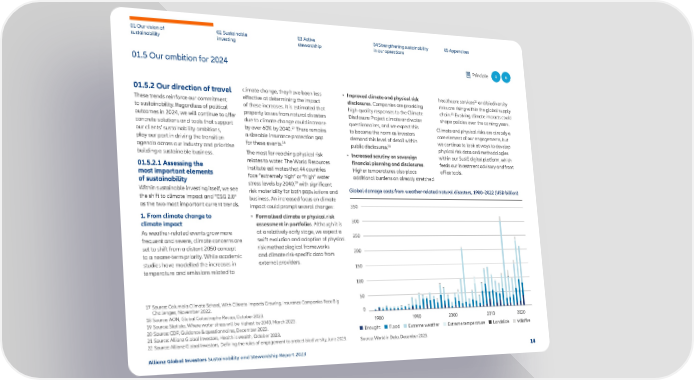 01 Our vision of 02 Sustainable 03 Active 04 Strengthening sustainability 05 Appendices sustainability investing stewardship in our operations 01.5 Our ambition for 2024 Principle 4 6 • Improved climate and physical risk 21 and biodiversity 01.5.2 Our direction of travel climate change, they have been less healthcare services These trends reinforce our commitment e昀昀ective at determining the impact disclosures. Companies are providing risks are rising within the global supply of these increases. It is estimated that high-quality responses to the Climate chain.22 Evolving climate impacts could to sustainability. Regardless of political property losses from natural disasters Disclosure Project climate and water shape policies over the coming years. outcomes in 2024, we will continue to o昀昀er due to climate change could increase questionnaires, and we expect this concrete solutions and tools that support Climate and physical risks are already a by over 60% by 2040.17 There remains to become the norm as investors core element of our engagements, but our clients’ sustainability ambitions, a sizeable insurance protection gap demand this level of detail within play our part in driving the transition we continue to look at ways to develop 18 20 agenda across our industry and prioritise for these events. public disclosures. physical risk data and methodologies building a sustainable business. The most far-reaching physical risk • Increased scrutiny on sovereign within our SusIE digital platform, which 01.5.2.1 Assessing the relates to water. The World Resources financial planning and disclosures. feeds our investment advisory and front most important elements Institute estimates that 44 countries Higher temperatures also place o昀케ce tools. of sustainability face “extremely high” or “high” water additional burdens on already stretched 19 stress levels by 2040, with signi昀椀cant Within sustainable investing itself, we see risk materiality for both populations and Global damage costs from weather-related natural disasters, 1980–2022 (USD billion) the shift to climate impact and “ESG 2.0” business. An increased focus on climate as the two most important current trends. impact could prompt several changes: 350 1. From climate change to • Formalised climate or physical risk 300 climate impact assessment in portfolios. Although it is As weather-related events grow more at a relatively early stage, we expect a 250 frequent and severe, climate concerns are swift evolution and adoption of physical set to shift from a distant 2050 concept risk methodological frameworks 200 to a nearer-term priority. While academic and climate risk-specific data from studies have modelled the increases in external providers. temperature and emissions related to 150 100 17 Source: Columbia Climate School, With Climate Impacts Growing, Insurance Companies Face Big 50 Challenges, November 2022. 0 18 Source: AON, Global Catastrophe Recap, October 2023. 19 Source: Statista, Where water stress will be highest by 2040, March 2023. 980 990 2000 200 2020 20 Source: CDP, Guidance & questionnaires, December 2023. Drought Flood Extreme weather Extreme temperature Landslide Wildfire 21 Source: Allianz Global Investors, Health is wealth, October 2023. 22 Source: Allianz Global Investors, De昀椀ning the rules of engagement to protect biodiversity, June 2023. Source: World in Data, December 2023. Allianz Global Investors Sustainability and Stewardship Report 2023 14