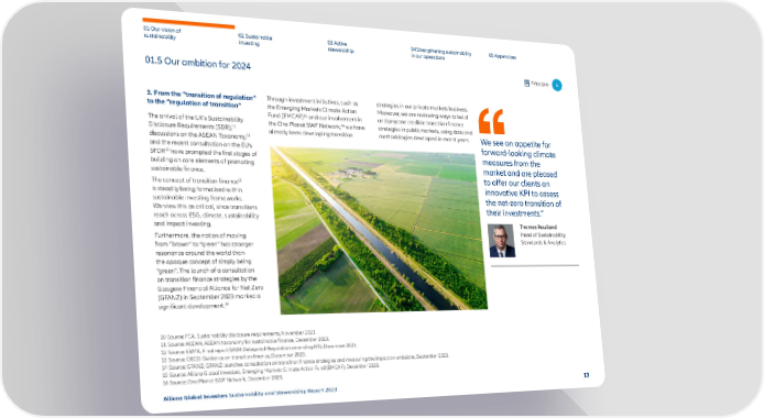 01 Our vision of 02 Sustainable 03 Active 04 Strengthening sustainability 05 Appendices sustainability investing stewardship in our operations 01.5 Our ambition for 2024 Principle 4 3. From the “transition of regulation” Through investment initiatives, such as strategies in our private markets business. to the “regulation of transition” the Emerging Markets Climate Action Moreover, we are reviewing ways to build 15 Fund (EMCAF) and our involvement in and propose credible transition 昀椀nance The arrival of the UK’s Sustainability 16 the One Planet SWF Network, we have strategies in public markets, using data and 10 Disclosure Requirements (SDR), already been developing transition methodologies developed in recent years. We see an appetite for discussions on the ASEAN Taxonomy,11 and the recent consultation on the EU’s forward-looking climate 12 SFDR have prompted the 昀椀rst stages of measures from the building on core elements of promoting market and are pleased sustainable 昀椀nance. to offer our clients an The concept of transition 昀椀nance13 innovative KPI to assess is steadily being formalised within sustainable investing frameworks. the net-zero transition of We view this as critical, since transitions their investments.” reach across ESG, climate, sustainability and impact investing. Thomas Roulland Furthermore, the notion of moving Head of Sustainability from “brown” to “green” has stronger Standards & Analytics resonance around the world than the opaque concept of simply being “green”. The launch of a consultation on transition 昀椀nance strategies by the Glasgow Financial Alliance for Net Zero (GFANZ) in September 2023 marked a signi昀椀cant development.14 10 Source: FCA, Sustainability disclosure requirements, November 2023. 11 Source: ASEAN, ASEAN taxonomy for sustainable 昀椀nance, December 2023. 12 Source: ESMA, Final report SFDR Delegated Regulation amending RTS, December 2023. 13 Source: OECD, Guidance on transition 昀椀nance, December 2023. 14 Source: GFANZ, GFANZ launches consultation on transition 昀椀nance strategies and measuring the impact on emissions, September 2023. 15 Source: Allianz Global Investors, Emerging Markets Climate Action Fund (EMCAF), December 2023. 16 Source: One Planet SWF Network, December 2023. Allianz Global Investors Sustainability and Stewardship Report 2023 13