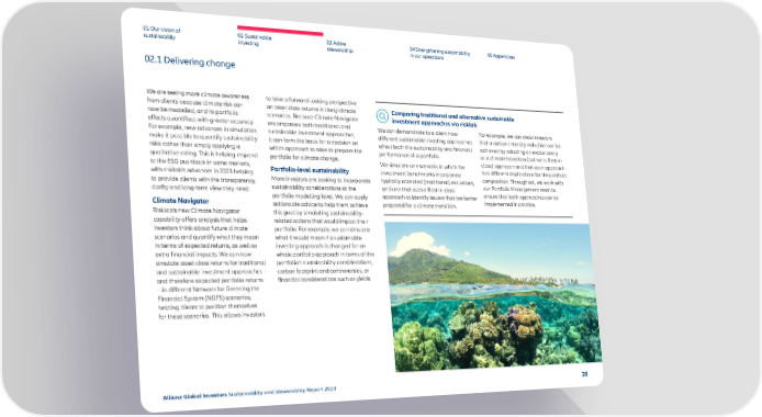 01 Our vision of 02 Sustainable 03 Active 04 Strengthening sustainability 05 Appendices sustainability investing stewardship in our operations 02.1 Delivering change We are seeing more climate awareness to take a forward-looking perspective from clients because climate risk can on asset class returns in likely climate Comparing traditional and alternative sustainable now be modelled, and its portfolio scenarios. Because Climate Navigator investment approaches via risklab e昀昀ects quanti昀椀ed, with greater accuracy. encompasses both traditional and We can demonstrate to a client how For example, we can show investors For example, new advances in simulation sustainable investment approaches, di昀昀erent sustainable investing approaches that a carbon intensity reduction can be make it possible to quantify sustainability it can form the basis for a decision on a昀昀ect both the sustainability and 昀椀nancial achieved by adopting an exclusionary risks rather than simply applying a which approach to take to prepare the performance of a portfolio. or a climate transition (but not a Best-in- qualitative rating. This is helping respond portfolio for climate change. We simulate one scenario in which the class) approach and that each approach to the ESG pushback in some markets, Portfolio-level sustainability investment benchmarks incorporate has di昀昀erent implications for the portfolio with risklab’s advances in 2023 helping typically accepted (traditional) exclusions, composition. Throughout, we work with to provide clients with the transparency, More investors are looking to incorporate our Portfolio Management team to clarity and long-term view they need. sustainability considerations at the and one that uses a Best-in-class ensure that both approaches can be portfolio modelling level. We can apply approach to identify issuers that are better implemented in practice. Climate Navigator actionable advice to help them achieve prepared for a climate transition. Risklab’s new Climate Navigator this goal by simulating sustainability- capability o昀昀ers analysis that helps related actions that would impact their investors think about future climate portfolio. For example, we can simulate scenarios and quantify what they mean what it would mean if a sustainable in terms of expected returns, as well as investing approach is changed for an extra 昀椀nancial impacts. We can now whole portfolio approach in terms of the simulate asset class returns for traditional portfolio’s sustainability considerations, and sustainable investment approaches – carbon footprint and controversies, or and therefore expected portfolio returns 昀椀nancial considerations such as yields. –in di昀昀erent Network for Greening the Financial System (NGFS) scenarios, helping clients to position themselves for these scenarios. This allows investors Allianz Global Investors Sustainability and Stewardship Report 2023 20