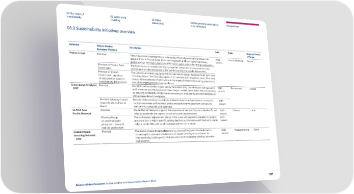 01 Our vision of 02 Sustainable 03 Active 04 Strengthening sustainability 05 Appendices sustainability investing stewardship in our operations 05.3 Sustainability initiatives overview Initiative Allianz Global Description Date Topics Region/Country Investors‘ Position of Scope France Invest Member French association representing private equity (PE) and private debt professionals 2021 – Impact Investing France active in France. France Invest promotes the growth of PE among entrepreneurs, present global savings managers, French and European public authorities and opinion leaders. Member of Private Debt The Commission is focused on bringing together investment professionals to foster Commission exchange and raise awareness of the trends faced by the private debt market. Member of Impact The Commission meets regularly with its members to discuss the issues faced by impact Commission, signatory investing players. The Commission assists its members with regulatory issues, 昀椀nancing of best practice guide to issues and best practice. Participation in the Impact Private Debt working group is also sustainability-linked loans part of the membership in the commission. Green Bond Principles Member The GBP are intended for broad use by the market: they provide issuers with guidance 2015 – Environment Global – GBP on the key components involved in launching a credible Green Bond; they aid investors present by ensuring availability of information necessary to evaluate the environmental impact of their Green Bond investments. Member Advisory Council The role of the Advisory Council is to advise the Executive Committee to increase its 2019 – Green Bonds and Social market awareness and outreach, and to enable further engagement with speci昀椀c present Bonds membership categories and observers. GFANZ Asia Member The GFANZ AP Network supports the expansion of net-zero 昀椀nance in Asia-Paci昀椀c and 2023 – Climate Asia Paci昀椀c Network helps to accelerate the region’s transition to a net-zero economy. present Working Group The workstream helps remain ahead of the curve with respect to transition in general 2023 – on coal-managed and transition in Asia in speci昀椀c, adding depth to our discussion with third party clients, present phase out – 昀椀nancial helps promote AllianzGI as a knowledge partner in the region. viability workstream Global Impact Member The Global Impact Investing Network is a non-pro昀椀t organisation dedicated to 2018 – Impact Investing Global Investing Network increasing the scale and e昀昀ectiveness of impact investing around the world. present – GIIN They do this by building critical infrastructure and developing activities, education and research. Allianz Global Investors Sustainability and Stewardship Report 2023 107