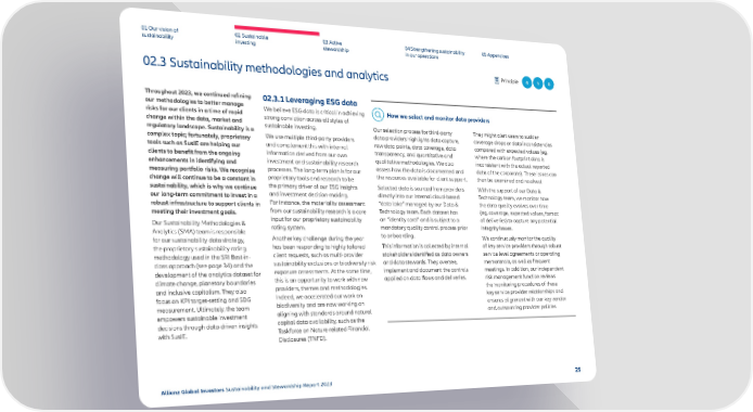 01 Our vision of 02 Sustainable 03 Active 04 Strengthening sustainability 05 Appendices sustainability investing stewardship in our operations 02.3 Sustainability methodologies and analytics Principle 4 5 8 Throughout 2023, we continued re昀椀ning 02.3.1 Leveraging ESG data our methodologies to better manage We believe ESG data is critical in achieving How we select and monitor data providers risks for our clients in a time of rapid strong conviction across all styles of change within the data, market and sustainable investing. Our selection process for third-party They might alert users to sudden regulatory landscape. Sustainability is a data providers highlights data capture, coverage drops or data inconsistencies complex topic; fortunately, proprietary We use multiple third-party providers raw data points, data coverage, data compared with expected values (eg, tools such as SusIE are helping our and complement this with internal transparency, and quantitative and where the carbon footprint data is clients to bene昀椀t from the ongoing information derived from our own qualitative methodologies. We also inconsistent with the actual reported enhancements in identifying and investment and sustainability research assess how the data is documented and data of the corporate). These issues can measuring portfolio risks. We recognise processes. The long-term plan is for our the resources available for client support. then be examined and resolved. change will continue to be a constant in proprietary tools and research to be sustainability, which is why we continue the primary driver of our ESG insights Selected data is sourced from providers With the support of our Data & our long-term commitment to invest in a and investment decision-making. directly into our internal cloud-based Technology team, we monitor how robust infrastructure to support clients in For instance, the materiality assessment “data lake” managed by our Data & the data quality evolves over time meeting their investment goals. from our sustainability research is a core Technology team. Each dataset has (eg, coverage, expected values, format Our Sustainability Methodologies & input for our proprietary sustainability an “identity card” and is subject to a of deliveries) to capture any potential Analytics (SMA) team is responsible rating system. mandatory quality control process prior integrity issues. for our sustainability data strategy, Another key challenge during the year to onboarding. We continuously monitor the quality the proprietary sustainability rating has been responding to highly tailored This information is collected by internal of key service providers through robust methodology used in the SRI Best-in- client requests, such as multi-provider stakeholders identi昀椀ed as data owners service level agreements or operating class approach (see page 34) and the sustainability exclusions or biodiversity risk and data stewards. They oversee, memoranda, as well as frequent development of the analytics dataset for exposure assessments. At the same time, implement and document the controls meetings. In addition, our independent climate change, planetary boundaries this is an opportunity to work with new applied on data 昀氀ows and deliveries. risk management function reviews and inclusive capitalism. They also providers, themes and methodologies. the monitoring procedures of these focus on KPI target-setting and SDG Indeed, we accelerated our work on key service provider relationships and measurement. Ultimately, the team biodiversity and are now working on ensures alignment with our key vendor empowers sustainable investment aligning with standards around natural and outsourcing provider policies. decisions through data-driven insights capital data availability, such as the with SusIE. Taskforce on Nature-related Financial Disclosures (TNFD). Allianz Global Investors Sustainability and Stewardship Report 2023 25