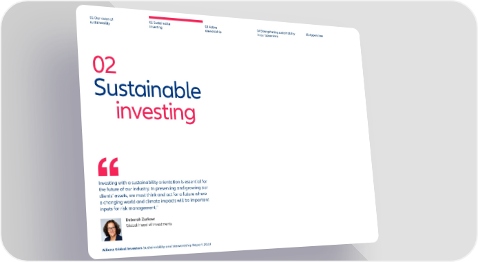 01 Our vision of 02 Sustainable 03 Active 04 Strengthening sustainability 05 Appendices sustainability investing stewardship in our operations 02 Sustainable investing Investing with a sustainability orientation is essential for the future of our industry. In preserving and growing our clients’ assets, we must think and act for a future where a changing world and climate impacts will be important inputs for risk management.” Deborah Zurkow Global Head of Investments Allianz Global Investors Sustainability and Stewardship Report 2023 18