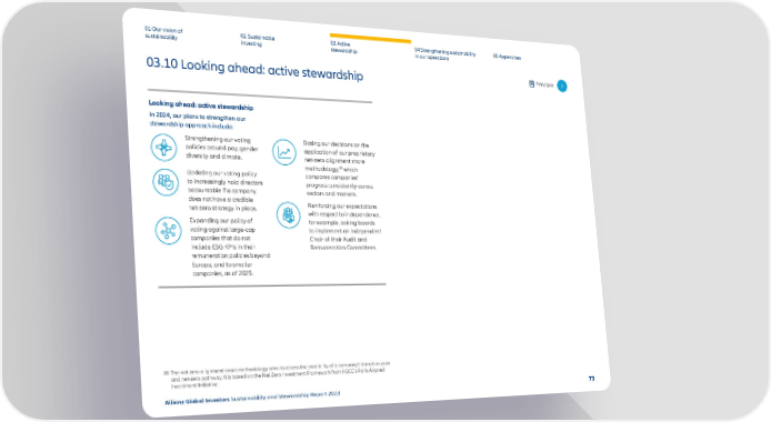 01 Our vision of 02 Sustainable 03 Active 04 Strengthening sustainability 05 Appendices sustainability investing stewardship in our operations 03.10 Looking ahead: active stewardship Principle 7 Looking ahead: active stewardship In 2024, our plans to strengthen our stewardship approach include: Strengthening our voting Basing our decisions on the policies around pay, gender application of our proprietary diversity and climate. net-zero alignment share 48 methodology, which Updating our voting policy compares companies’ to increasingly hold directors progress consistently across accountable if a company sectors and markets. does not have a credible Reinforcing our expectations net-zero strategy in place. with respect to independence, Expanding our policy of for example, asking boards voting against large-cap to implement an independent companies that do not Chair of their Audit and include ESG KPIs in their Remuneration Committees. remuneration policies beyond Europe, and to smaller companies, as of 2025. 48 The net-zero alignment share methodology aims to assess the credibility of a company’s transition plan and net-zero pathway. It is based on the Net Zero Investment Framework from IIGCC’s Paris Aligned Investment Initiative. Allianz Global Investors Sustainability and Stewardship Report 2023 73