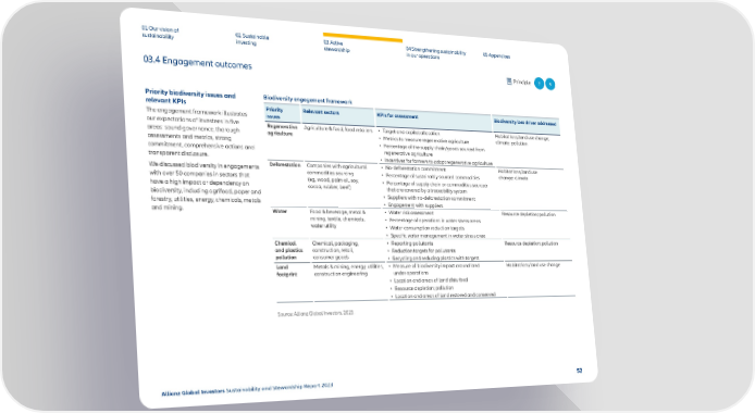 01 Our vision of 02 Sustainable 03 Active 04 Strengthening sustainability 05 Appendices sustainability investing stewardship in our operations 03.4 Engagement outcomes Principle 7 9 Priority biodiversity issues and Biodiversity engagement framework relevant KPIs Priority Relevant sectors KPIs for assessment Biodiversity loss driver addressed The engagement framework illustrates issues our expectations of investees in 昀椀ve Regenerative Agriculture & food, food retailers • Target and capital allocation Habitat loss/land use change; areas: sound governance, thorough agriculture • Metrics to measure regenerative agriculture climate; pollution assessments and metrics, strong • Percentage of the supply chain/goods sourced from commitment, comprehensive actions and regenerative agriculture transparent disclosure. • Incentives for farmers to adopt regenerative agriculture We discussed biodiversity in engagements Deforestation Companies with agricultural • No-deforestation commitment Habitat loss/land use with over 50 companies in sectors that commodities sourcing • Percentage of sustainably sourced commodities change; climate have a high impact or dependency on (eg, wood, palm oil, soy, • Percentage of supply chain or commodities sourced cocoa, rubber, beef) that are covered by a traceability system biodiversity, including agrifood, paper and • Suppliers with no-deforestation commitment forestry, utilities, energy, chemicals, metals • Engagement with suppliers and mining. Water Food & beverage, metal & • Water risk assessment Resource depletion; pollution mining, textile, chemicals, • Percentage of operations in water stress areas water utility • Water consumption reduction targets • Speci昀椀c water management in water stress area Chemical Chemical, packaging, • Reporting pollutants Resource depletion; pollution and plastics construction, retail, • Reduction targets for pollutants pollution consumer goods • Recycling and reducing plastics with targets Land Metals & mining, energy, utilities, • Measure of biodiversity impact around land Habitat loss/land use change footprint construction engineering under operations • Location and areas of land disturbed • Resource depletion; pollution • Location and areas of land restored and conserved Source: Allianz Global Investors, 2023. Allianz Global Investors Sustainability and Stewardship Report 2023 52