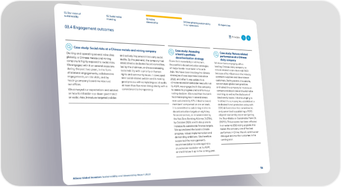 01 Our vision of 02 Sustainable 03 Active 04 Strengthening sustainability 05 Appendices sustainability investing stewardship in our operations 03.4 Engagement outcomes Principle 7 9 Case study: Social risks at a Chinese metals and mining company Case study: Assessing Case study: Nature-related a bank’s portfolio performance at a Chinese Owning and operating several mine sites and actively implement third-party social decarbonisation strategy dairy company globally, a Chinese metals and mining audits. By the year-end, the company had Given their materiality and impacts, We have been engaging with a company is highly exposed to social risks. established a dedicated board committee, the portfolio decarbonisation strategies leading Chinese dairy company on We engaged with it on several occasions led by the chairman, and was overseeing of major banks have been a focus in nature-related topics since mid-2022 during the past two years, in the form sustainability with a priority on human Asia. We have been tracking the climate because of its in昀氀uence on the industry, of bilateral engagements, collaborative rights and community issues. It developed strategies of one Japanese bank since upstream suppliers and downstream engagements, on-site visits, and by nine social-related policies and is making 2022, and after it was subject to a customers. During several discussions, hosting company board members at good process with completing social audits climate-related shareholder resolution at we conveyed global best practices our o昀케ces. at more than 昀椀ve mine sites globally, with a its AGM, we engaged with the company and asked the company to improve on We conveyed our expectations and advised commitment to transparency. to assess its progress and to inform our company-wide policies and sustainable on how to establish top-down governance voting decision. We noted that the bank sourcing, as well as the disclosure of on social risks, introduce targeted policies had made progress in several areas: biodiversity topics. It is encouraging to new sustainability KPIs linked to board 昀椀nd that the company has established a members’ compensation are on track; dedicated forest protection policy with it is committed to publishing mid-term 2030 deforestation-free commitments decarbonisation targets on eight key and committed to publishing a TCFD- 昀椀nanced sectors, as recommended by aligned biodiversity report and joining the Net Zero Banking Alliance (NZBA), the Roundtable on Sustainable Palm Oil by October 2024; and it also plans to (RSPO). This progress has been re昀氀ected increase its sustainable 昀椀nance targets. in an external ESG rating upgrade that We appreciated the bank’s climate makes the company one of the best progress, robust implementation and performers in China. We will continue our demanding ambitions. We therefore dialogue and monitor outcomes in the supported the management’s coming year. recommendation to vote against a shareholder resolution at its AGM, and will follow it up in the coming year. Allianz Global Investors Sustainability and Stewardship Report 2023 56