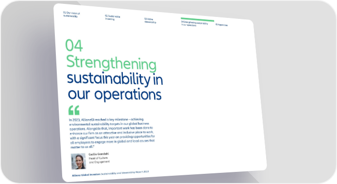 01 Our vision of 02 Sustainable 03 Active 04 Strengthening sustainability 05 Appendices sustainability investing stewardship in our operations 04 Strengthening sustainability in our operations In 2023, AllianzGI reached a key milestone – achieving environmental sustainability targets in our global business operations. Alongside that, important work has been done to enhance our firm as an attractive and inclusive place to work, with a significant focus this year on providing opportunities for all employees to engage more in global and local causes that matter to us all.” Cecilia Grøndahl Head of Culture and Engagement Allianz Global Investors Sustainability and Stewardship Report 2023 74