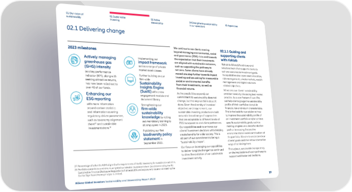 01 Our vision of 02 Sustainable 03 Active 04 Strengthening sustainability 05 Appendices sustainability investing stewardship in our operations 02.1 Delivering change We continue to see clients moving 02.1.1 Guiding and 2023 milestones beyond managing environmental, social supporting clients and governance (ESG) risks and towards with risklab Actively managing Implementing our the expectation that their investments greenhouse gas impact framework are aligned with sustainable outcomes, Risklab is AllianzGI’s advisory and across a range of private such as supporting the pathway to solutions team that supports clients to (GHG) intensity market asset classes. net zero. Some clients have already achieve sustainable investment goals. as a key performance moved one step further towards impact Its capabilities also cover asset allocation, indicator (KPI), along with Further building on our investing and are asking for measurable risk management, private markets, wealth seeking attractive returns, 昀椀rm-wide social or environmental bene昀椀ts management and digital solutions- has now been rolled out to Sustainability from their investments, as well as related objectives. over 40 of our funds. Insights Engine 昀椀nancial returns. We assess our clients’ sustainability Enhancing our (SusIE) with a new As the possibilities expand, our ambition levels by discussing best market engagement module and commitment to sustainability does not practice. As a core feature of our o昀昀er, ESG reporting document library. change, but the way we think about it we help clients gauge the sustainability with more information Strengthening our does. Given the diversity of investors’ pro昀椀le of their portfolios alongside around carbon statistics 昀椀rm-wide objectives and requirements, our 昀椀nancial risk-and-return characteristics. and information covering sustainability sustainable investing products are built This is the basis for our advice on how regulatory-driven parameters, knowledge by rolling around a broad range of approaches to improve the sustainability pro昀椀le of such as taxonomy alignment out mandatory training to that are adaptable to di昀昀erent levels of an investment portfolio and/or achieve 27 ESG incorporation and client preferences. speci昀椀c sustainability goals, such as share and sustainable all employees in 2023. 28 Our capabilities seek to enhance our making progress on a decarbonisation investment share. Publishing our 昀椀rst clients’ investment decisions while helping path or increasing the positive biodiversity policy create bene昀椀ts for wider society. This is environmental or social contributions of statement in all part of our commitment to being a the portfolio. We aim to understand our September 2023. “sustainability shaper”. clients’ goals and then show alternative Our focus on leveraging our capabilities ways of achieving them. to deliver tangible change has continued Throughout, we provide transparency to drive the evolution of our sustainable on the implications of each pathway to investment activity. support well-balanced decisions. 27 Percentage of a fund’s AUM aligned with requirements of the EU taxonomy for sustainable activities. 28 Portfolio commits to a minimum weighted sustainable investment share (as determined by the EU Sustainable Finance Disclosure Regulation) of at least 20% and exposure to issuers not meeting the Do No Signi昀椀cant Harm principle is limited. Allianz Global Investors Sustainability and Stewardship Report 2023 19