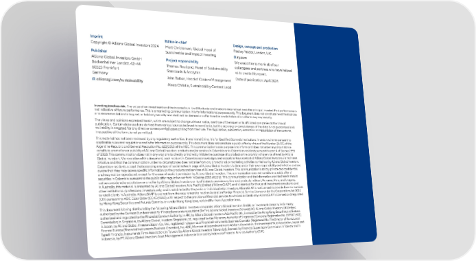Imprint Editor-in-chief Design, concept and production Copyright © Allianz Global Investors 2024 Matt Christensen, Global Head of Radley Yeldar, London, U.K. Publisher Sustainable and Impact Investing ry.com Allianz Global Investors GmbH Project responsibility We would like to thank all of our Bockenheimer Landstr. 42–44 Thomas Roulland, Head of Sustainability colleagues and partners who have helped 60323 Frankfurt Standards & Analytics us to create this report. Germany John Bolton, Head of Content Management Date of publication: April 2024 allianzgi.com/sustainability Alexa Christie, Sustainability Content Lead Investing involves risk. The value of an investment and the income from it will 昀氀uctuate and investors may not get back the principal invested. Past performance is not indicative of future performance. This is a marketing communication. It is for informational purposes only. This document does not constitute investment advice or a recommendation to buy, sell or hold any security and shall not be deemed an o昀昀er to sell or a solicitation of an o昀昀er to buy any security. The views and opinions expressed herein, which are subject to change without notice, are those of the issuer or its a昀케liated companies at the time of publication. Certain data used are derived from various sources believed to be reliable, but the accuracy or completeness of the data is not guaranteed and no liability is assumed for any direct or consequential losses arising from their use. The duplication, publication, extraction or transmission of the contents, irrespective of the form, is not permitted. This material has not been reviewed by any regulatory authorities. In mainland China, it is for Quali昀椀ed Domestic Institutional Investors scheme pursuant to applicable rules and regulations and is for information purpose only. This document does not constitute a public o昀昀er by virtue of Act Number 26.831 of the Argentine Republic and General Resolution No. 622/2013 of the NSC. This communication’s sole purpose is to inform and does not under any circumstance constitute promotion or publicity of Allianz Global Investors products and/or services in Colombia or to Colombian residents pursuant to part 4 of Decree 2555 of 2010. This communication does not in any way aim to directly or indirectly initiate the purchase of a product or the provision of a service o昀昀ered by Allianz Global Investors. Via reception of this document, each resident in Colombia acknowledges and accepts to have contacted Allianz Global Investors via their own initiative and that the communication under no circumstances does not arise from any promotional or marketing activities carried out by Allianz Global Investors. Colombian residents accept that accessing any type of social network page of Allianz Global Investors is done under their own responsibility and initiative and are aware that they may access speci昀椀c information on the products and services of Allianz Global Investors. This communication is strictly private and con昀椀dential and may not be reproduced, except for the case of explicit permission by Allianz Global Investors. This communication does not constitute a public o昀昀er of securities in Colombia pursuant to the public o昀昀er regulation set forth in Decree 2555 of 2010. This communication and the information provided herein should not be considered a solicitation or an o昀昀er by Allianz Global Investors or its a昀케liates to provide any 昀椀nancial products in Brazil, Panama, Peru, and Uruguay. In Australia, this material is presented by Allianz Global Investors Asia Paci昀椀c Limited (“AllianzGI AP”) and is intended for the use of investment consultants and other institutional /professional investors only, and is not directed to the public or individual retail investors. AllianzGI AP is not licensed to provide 昀椀nancial services to retail clients in Australia. AllianzGI AP is exempt from the requirement to hold an Australian Foreign Financial Service License under the Corporations Act 2001 (Cth) pursuant to ASIC Class Order (CO 03/1103) with respect to the provision of 昀椀nancial services to wholesale clients only. AllianzGI AP is licensed and regulated by Hong Kong Securities and Futures Commission under Hong Kong laws, which di昀昀er from Australian laws. This document is being distributed by the following Allianz Global Investors companies: Allianz Global Investors GmbH, an investment company in Germany, authorized by the German Bundesanstalt für Finanzdienstleistungsaufsicht (BaFin); Allianz Global Investors (Schweiz) AG; Allianz Global Investors UK Limited, authorized and regulated by the Financial Conduct Authority; in HK, by Allianz Global Investors Asia Paci昀椀c Ltd., licensed by the Hong Kong Securities and Futures Commission; in Singapore, by Allianz Global Investors Singapore Ltd., regulated by the Monetary Authority of Singapore [Company Registration No. 199907169Z]; in Japan, by Allianz Global Investors Japan Co., Ltd., registered in Japan as a Financial Instruments Business Operator [Registered No. The Director of Kanto Local Finance Bureau (Financial Instruments Business Operator), No. 424], Member of Japan Investment Advisers Association, the Investment Trust Association, Japan and Type II Financial Instruments Firms Association; in Taiwan, by Allianz Global Investors Taiwan Ltd., licensed by Financial Supervisory Commission in Taiwan; and in Indonesia, by PT. Allianz Global Investors Asset Management Indonesia licensed by Indonesia Financial Services Authority (OJK).
