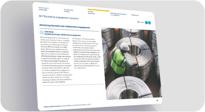 01 Our vision of 02 Sustainable 03 Active 04 Strengthening sustainability 05 Appendices sustainability investing stewardship in our operations 03.7 Escalating engagement concerns Principle 7 11 Advancing thematic and collaborative engagement Case study: Escalating through collaborative engagement We had engaged with a steel-producing Following an introductory meeting company on a variety of topics, including between the investors and company decarbonisation projects, investments in representatives responsible for the topic renewables, the Science-Based Targets on both executive and management initiative (SBTi) and health and safety committees, we sought to better issues. While we are satis昀椀ed with the understand the drivers for the most recent status of its decarbonisation investment incident, as well as wider background on plan, which is well on track to deliver its health and safety governance processes. 2030 decarbonisation target, we continue Our expectation is that a full review of the to see the information given on reasons company’s safety management systems for fatality and accident frequency as will be undertaken. We intend to follow unspeci昀椀c and insu昀케ciently transparent. up once this has been completed to This lack of clarity also applied to remedial understand the improvements that will measures taken. We therefore decided be implemented. to initiate a collaborative engagement and convened a group of like-minded investors to discuss health and safety, given insu昀케cient prior responses, continued fatalities/incidents and perceived lack of traction in one-to-one meetings. Allianz Global Investors Sustainability and Stewardship Report 2023 63