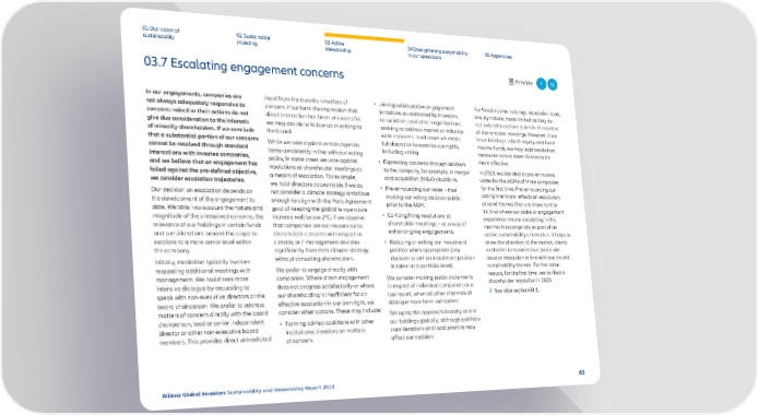 01 Our vision of 02 Sustainable 03 Active 04 Strengthening sustainability 05 Appendices sustainability investing stewardship in our operations 03.7 Escalating engagement concerns Principle 7 11 In our engagements, companies are input from the board on matters of • Joining collaborative engagement For 昀椀xed income holdings, escalation tools not always adequately responsive to concern. If we form the impression that initiatives co-ordinated by investors, are, by nature, more limited as they do concerns raised or their actions do not direct interaction has been unsuccessful, associations and other organisations not extend to actions taken in the context give due consideration to the interests we may decide to follow up in writing to seeking to address market or industry- of shareholder meetings. However, if we of minority shareholders. If we conclude the board. wide concerns. In all cases we retain have holdings in both equity and 昀椀xed that a substantial portion of our concerns While we vote against certain agenda full discretion to exercise our rights, income funds, we may lead escalation cannot be resolved through standard items consistently in line with our voting including voting. measures across asset classes to be interactions with investee companies, policy, in some cases we vote against • Expressing concerns through advisers more e昀昀ective. and we believe that an engagement has resolutions at shareholder meetings as to the company, for example, in merger In 2023, we decided to pre-announce failed against the pre-de昀椀ned objective, a means of escalation. For example, and acquisition (M&A) situations. votes for the AGMs of three companies we consider escalation trajectories. we hold directors accountable if we do • Pre-announcing our votes – thus for the 昀椀rst time. Pre-announcing our Our decision on escalation depends on not consider a climate strategy ambitious making our voting decision public voting intentions re昀氀ects an escalation the development of the engagement to enough to align with the Paris Agreement prior to the AGM. around themes that are important to date. We take into account the nature and goal of keeping the global temperature • Co-filing/filing resolutions at us, and where our stake or engagement magnitude of the unresolved concerns, the increase well below 2ºC; if we observe shareholder meetings – as a way of experience means escalating in this relevance of our holdings in certain funds that companies are not responsive to enhancing key engagements. manner is appropriate as part of an and considerations around the scope to shareholder concerns with respect to active sustainability orientation. It helps to escalate to a more senior level within climate; or if management deviates • Reducing or exiting our investment draw the attention of the market, clients the company. signi昀椀cantly from their climate strategy position when appropriate (any and other companies to a particular Initially, escalation typically involves without consulting shareholders. decision to exit an investment position issue or resolution in line with our pivotal requesting additional meetings with We prefer to engage directly with is taken at a portfolio level). sustainability themes. For the same management. We could seek more companies. Where direct engagement We consider making public statements reason, for the 昀椀rst time, we co-昀椀led a intensive dialogue by requesting to does not progress satisfactorily or where in respect of individual companies as a shareholder resolution in 2023. speak with non-executive directors or the our shareholding is insu昀케cient for an last resort, when all other channels of See also section 03.1. board chairperson. We prefer to address e昀昀ective escalation in our own right, we dialogue have been exhausted. matters of concern directly with the board consider other options. These may include: We apply this approach broadly across chairperson, lead or senior independent • Forming ad-hoc coalitions with other our holdings globally, although portfolio director or other non-executive board institutional investors on matters considerations and local practice may members. This provides direct unmediated of concern. a昀昀ect our decision. Allianz Global Investors Sustainability and Stewardship Report 2023 61