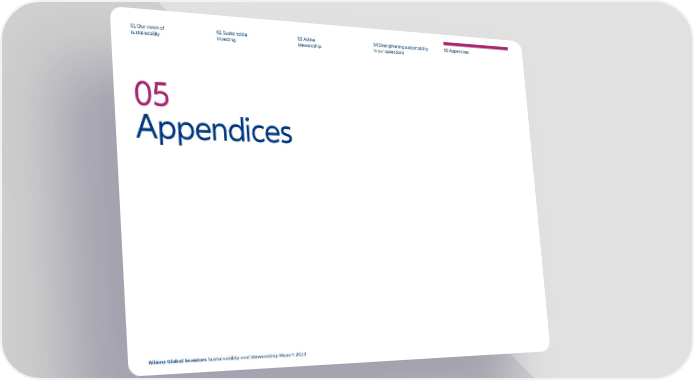 01 Our vision of 02 Sustainable 03 Active 04 Strengthening sustainability 05 Appendices sustainability investing stewardship in our operations 05 Appendices Allianz Global Investors Sustainability and Stewardship Report 2023 94 2023 | Sustainability Report Page 94 Page 96