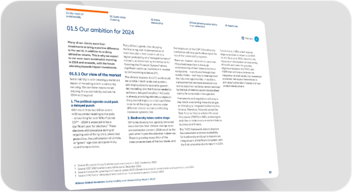 01 Our vision of 02 Sustainable 03 Active 04 Strengthening sustainability 05 Appendices sustainability investing stewardship in our operations 01.5 Our ambition for 2024 Principle 4 Many of our clients want their The political agenda risks delaying the targets set at the COP 15 biodiversity Furthermore, CSRD, which requires investments to bring a positive di昀昀erence the 昀椀nancing and implementation of conference will help put biodiversity at the large corporates to report as of 2025 to the world, in addition to seeking transition plans that could result in a top of the sustainability agenda. for the 昀椀scal year 2024, stipulates the attractive returns. This is why we expect higher probability of a “delayed transition” There are, however, obstacles to overcome. inclusion of information on biodiversity. to see even more sustainable investing scenario, as described by the Network for Many businesses lack a thorough AllianzGI welcomes the growing 8 alignment between the TNFD and in 2024 and onwards, with the future Greening the Financial System, where understanding of their dependencies on orienting towards impact investments. signi昀椀cant catch-up investment is needed ecosystems – in particular through their CSRD that will help accelerate the to limit warming to below 2°C. supply chains – and how to manage both integration of biodiversity into investment 01.5.1 Our view of the market The climate impacts of a 2°C world could the risks and opportunities. In addition, processes. We expect these trends to Sustainability is an increasingly dominant be volatile in both scale and location, companies that are more advanced and stimulate further client interest and new aspect of investing and it is constantly with implications for economic growth, wish to build their resilience remain restricted product development. evolving. We see three macro trends risk modelling and the 昀椀nance needed to by the lack of data to support standardised shaping the sustainability outlook for 9 metrics for conservation management. achieve a delayed transition. AllianzGI 2024 and beyond: is already providing advisory analysis on Frameworks and regulations will play a 1. The political agenda could pack the potential impact on client portfolios key role in overcoming these challenges a delayed punch in terms of the drag on returns under and helping to integrate biodiversity into With more than two billion voters di昀昀erent climate scenarios re昀氀ecting 昀椀nance. Therefore, AllianzGI joined the in 50 countries heading to the polls increased systemic risk. Task Force on Nature-related Financial – accounting for over 50% of global 2. Biodiversity takes centre stage Disclosures (TNFD) in 2023, endorsing its GDP6 – 2024 is expected to be a While biodiversity has typically attracted ambition to reduce nature-related risks to 7 business and 昀椀nance. signi昀椀cant year for elections. These less attention than climate change as an elections will take place during an environmental concern, 2024 could be the The TNFD framework aims to improve ongoing cost-of-living crisis, precarious year when it gets the attention it deserves. the assessment and data availability geopolitics, the politicisation of climate There is growing recognition of the for biodiversity and is set to become an or “green” agendas and potentially interconnectedness of the two issues, and integral part of the 昀椀nancial system, with record temperatures. the 昀椀rst companies due to report in 2024. 6 Source: Brunswick Group, Eight key elections to watch in 2024, September 2023. 7 Source: WEF, 2024 elections around the world, December 2023. 8 Source: Network for greening the 昀椀nancial system, NGFS Climate Scenarios for central banks and supervisors, June 2021. 9 Source: IMF, Further delaying climate policies will hurt economic growth, October 2022. Allianz Global Investors Sustainability and Stewardship Report 2023 12