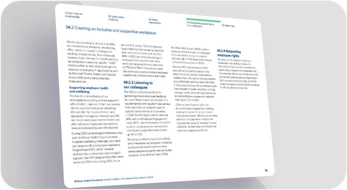 01 Our vision of 02 Sustainable 03 Active 04 Strengthening sustainability 05 Appendices sustainability investing stewardship in our operations 04.2 Creating an inclusive and supportive workplace We are also working to ensure that o昀케ce annual AES survey, 72% of employees The Work Well Index+ (WWi+), which 04.2.4 Respecting environments are attractive, refurbishing responded that the company’s bene昀椀ts measures the stress level of employees employee rights o昀케ce spaces to support employees in plan meets their needs well, up from for work-related strain, also saw an We ensure that employee rights are working collaboratively. To continuously 69% in 2022, while the percentage of all-time high of 73% favourable answers protected in all entities. In line with improve digital literacy for hybrid working, employees feeling able to balance (+3 percentage points on 2022). Allianz’s principles, we are committed to we dedicated a week for speci昀椀c “Fit4IT” work and personal life has risen from Overall, AES improvements in 2023 continuing to respect and implement the training o昀昀ers to help employees get the to 77% from 74% in the previous year. were driven by positive results in the fundamental rights and principles at work most out of everyday IT applications, such We continue to work to make employees’ areas of culture, process improvement, of the International Labour Organization as Microsoft Teams, Notes and Outlook. experiences in these areas meaningful. collaboration, risk culture and perceptions (ILO), as well as the principles of the UN Around 500 participants attended around 昀氀exible working. Areas identi昀椀ed Global Compact and the OECD Guidelines these sessions. 04.2.3 Listening to in the survey that we will be addressing for our colleagues improvement include innovation, driving for Multinational Companies. Supporting employee health and wellbeing The AES is our formal platform for change, further streamlining of processes The health and wellbeing of our gathering annual employee feedback and providing employees with relevant employees is a priority, and we support it on how it feels to work at AllianzGI. It is training for future skills. with a holistic approach that incorporates supplemented with regular Pulse surveys LEGs are one of several pillars to mental, social and physical wellbeing. that help track our progress against drive employee engagement, helping We consider the causes of stress and speci昀椀c commitments or focus areas. employees to connect across shared depression through an intersectional DEI In 2023 the AES participation rate was interests and topics. AES results correlate lens to promote good mental health and 84%, with the Employee Engagement with local engagement activity and o昀昀er advice on topics such as nutrition, Index (EEI) – which measures the extent illustrate the value of investing in these sleep and managing work-life balance. to which employees are motivated to initiatives, as they help to energise and During 2023 we leveraged milestone days contribute to organisational success – retain an engaged workforce. such as World Health Day to promote up 3% to 72%. targeted wellbeing messages, and used The Inclusive Meritocracy Index (IMIX), our long-standing Employee Assistance which measures our progress in creating Programme (EAP), which includes a culture and working environment professional, anonymous psychological where people and performance matter, support. Our EAP programme o昀昀ers were remained at its all-time high of 78%. accessed 248 times during 2023. In our Allianz Global Investors Sustainability and Stewardship Report 2023 81