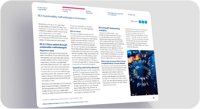 01 Our vision of 02 Sustainable 03 Active 04 Strengthening sustainability 05 Appendices sustainability investing stewardship in our operations 02.3 Sustainability methodologies and analytics Principle 4 5 8 Reinforcing our focus on the application to ensure we advertise our products 02.3.3 SusIE empowering SusIE is also the main portal for accessing of high-quality, actionable ESG data, Matt responsibly and in line with regulation. analytics proprietary sustainability scores with Christensen became a board member of the Net-zero focus Introduced in 2022, SusIE is a key transparent and granular indicators. GRESB Foundation in 2023. The foundation The topic of climate provides another enabler of active investment decisions In 2023, SusIE will also distribute in-house is an independent, not-for-pro昀椀t concrete example where we see a growing on sustainability across asset classes, research – thematic, sector and company organisation that sets global standards demand for risk management approaches feeding front o昀케ce tools and interfaces research – from our sustainability research for assessing the ESG performance of real targeting decarbonisation or net-zero with consistent ESG data. Today, SusIE is and stewardship analysts. External and estate, infrastructure and other assets. aligned strategies. As such, one of our the global sustainability tool for AllianzGI, internal insights contribute to the real key developments was to successfully used by investment experts, product integration of sustainability in our active 02.3.2 Value added through roll out an innovative net-zero alignment investment decisions. sustainable methodologies specialists, risk management and other share methodology aimed at increasing stakeholders. This contributes to our Regulatory needs investments in companies that are already market di昀昀erentiation on how we tackle Regulation continues to evolve and has net-zero aligned or aligning towards a net- sustainability, leveraging our expertise been a key driver of our sustainability risk zero pathway. This methodology, based via a powerful proprietary engine that management. During the last year, we have on the net-zero Investment Framework delivers added value for our clients. created additional KPIs for pre- and post- from the Institutional Investors Group on Wide range of external ESG datasets trade checks, but with a standardised Climate Change (IIGCC), is also leveraging complemented by in-house research and automated approach. This means we recognised and accepted standards. Our multi-provider-based strategy for ESG can meet the client and market demands Supporting sustainability disclosures data ensures that we bene昀椀t from a broad for accurate and consistent proof points, This was the 昀椀rst year in which we disclosed spectrum of data inputs. SusIE processes, coupled with the respective methodology an SFDR Principal Adverse Impact (PAI) computes and transforms data from supporting them. We supported clients in 29 understanding the EU taxonomy sustainable statement. While challenging to achieve, more than 10 third-party vendors into investment share requirement and ESG risk this marked an important transparency standardised datasets using cloud data monitoring in Asia. milestone, given its focus on our evaluation storage. This includes automated checks of the PAIs of our investment decisions on of pre- and post-data processing to ensure We review methodologies at least annually sustainability factors. In 2024, we will focus high-quality standards and data integrity and, as more information is disclosed, we on aligning with the coming Corporate across the value chain. are strengthening our ability to precisely Sustainability Reporting Directive, as classify what is, or is not, a sustainable well as with market practices that are still activity, as determined by the EU taxonomy, evolving for a number of the PAIs. 29 Allianz Global Investors Principal Adverse Impact Statement, 2023. Allianz Global Investors Sustainability and Stewardship Report 2023 26