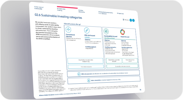 01 Our vision of 02 Sustainable 03 Active 04 Strengthening sustainability 05 Appendices sustainability investing stewardship in our operations 02.6 Sustainable investing categories Principle 4 7 31 We provide investment solutions AllianzGI’s product o昀昀ering with di昀昀ering levels of sustainability incorporation. Our product range caters to clients’ sustainability objectives and preferences. These categories also provide transparency on the Conventional ESG risk-focused Sustainability-focused Impact-focused SFDR characteristics of our products Objectives EUR 89bn EUR 199bn combined (which will evolve as the direction of Financial returns and active the SFDR is clari昀椀ed). risk management Objectives Objectives Objectives Financial returns and material E, Financial returns and Financial returns S and G risk considerations sustainability objectives and measurable and values sustainable outcomes Qualifying approach Qualifying approaches Qualifying approaches Integrated ESG SRI Best-in-class Impact (Art.9) KPI-based approach SDG-aligned: Multi Asset sustainability blend Fixed Income | Multi Asset | ESG score approach Private Markets (Art.9) SDG-aligned: Equity (Art.8) Classi昀椀ed as not sustainable Classi昀椀ed as sustainable Classi昀椀ed as Article Article 6* only Article 8* 8 or 9* Firm-wide exclusions Sustainable minimum exclusions Source: Allianz Global Investors, November 2023. ESG: Environmental, Social and Governance. SRI: Sustainable and Responsible ESG risk assessment: identi昀椀cation and consideration of sustainability risks and adverse impacts Investing. KPI: Key Performance Indicator. For illustrative purposes only. Exclusions apply to direct investments. ESG risk-focused category (also known as the integrated ESG investment approach) is not considered sustainable according Active stewardship: company engagement and proxy voting to EU Sustainable Finance Disclosure Regulation. Sustainable or impact investing private markets strategies apply the Allianz ESG Integration Framework exclusions. Allianz Global Investors supports the UN Sustainable Development Goals 31 Note that “sustainability-focused” and “impact-focused” are Allianz GIobal Investors product categories. Reference to a fund being within them does not (UN SDGs). *According to EU SFDR regulation. indicate that fund has a “Sustainability Focus” or “Sustainability Impact” label under the United Kingdom’s Sustainability Disclosure Requirements (SDR). Allianz Global Investors Sustainability and Stewardship Report 2023 31
