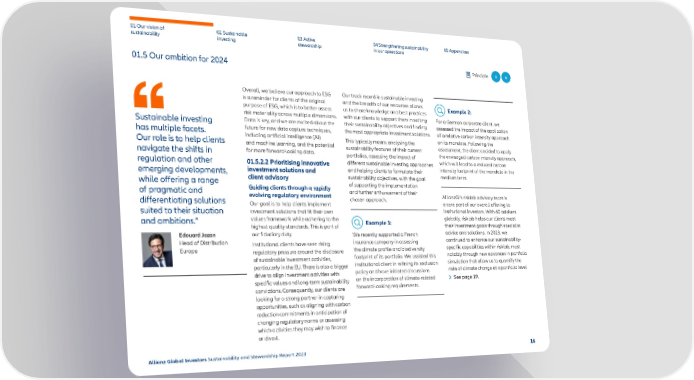 01 Our vision of 02 Sustainable 03 Active 04 Strengthening sustainability 05 Appendices sustainability investing stewardship in our operations 01.5 Our ambition for 2024 Principle 4 6 Overall, we believe our approach to ESG Our track record in sustainable investing is a reminder for clients of the original and the breadth of our resources allows Example 2: purpose of ESG, which is to better assess us to share knowledge and best practices risk materiality across multiple dimensions. with our clients to support them in setting For a German corporate client, we Sustainable investing Data is key, and we are excited about the their sustainability objectives and 昀椀nding assessed the impact of the application has multiple facets. future for new data capture techniques, the most appropriate investment solutions. of a relative carbon intensity approach Our role is to help clients including arti昀椀cial intelligence (AI) This typically means analysing the on its mandate. Following the and machine learning, and the potential sustainability features of their current assessment, the client decided to apply navigate the shifts in for more forward-looking data. portfolios, assessing the impact of the envisaged carbon intensity approach, regulation and other 01.5.2.2 Prioritising innovative di昀昀erent sustainable investing approaches which will lead to a reduced carbon emerging developments, investment solutions and and helping clients to formulate their intensity footprint of the mandate in the client advisory sustainability objectives, with the goal medium term. while offering a range Guiding clients through a rapidly of supporting the implementation of pragmatic and evolving regulatory environment and further enhancement of their AllianzGI’s risklab advisory team is differentiating solutions Our goal is to help clients implement chosen approach. a core part of our overall o昀昀ering to suited to their situation investment solutions that 昀椀t their own institutional investors. With 60 advisers and ambitions.” values framework while adhering to the Example 1: globally, risklab helps our clients meet highest quality standards. This is part of their investment goals through specialist Edouard Jozan our 昀椀duciary duty. We recently supported a French advice and solutions. In 2023, we Head of Distribution Institutional clients have seen rising insurance company in assessing continued to enhance our sustainability- Europe regulatory pressure around the disclosure the climate pro昀椀le and biodiversity speci昀椀c capabilities within risklab, most of sustainable investment activities, footprint of its portfolio. We assisted this notably through new advances in portfolio particularly in the EU. There is also a bigger institutional client in re昀椀ning its exclusion simulation that allow us to quantify the drive to align investment activities with policy and have initiated discussions risks of climate change at a portfolio level speci昀椀c values and long-term sustainability on the incorporation of climate-related See page 19. convictions. Consequently, our clients are forward-looking requirements. looking for a strong partner in capturing opportunities, such as aligning with carbon reduction commitments in anticipation of changing regulatory norms or assessing which activities they may wish to 昀椀nance or divest. Allianz Global Investors Sustainability and Stewardship Report 2023 16