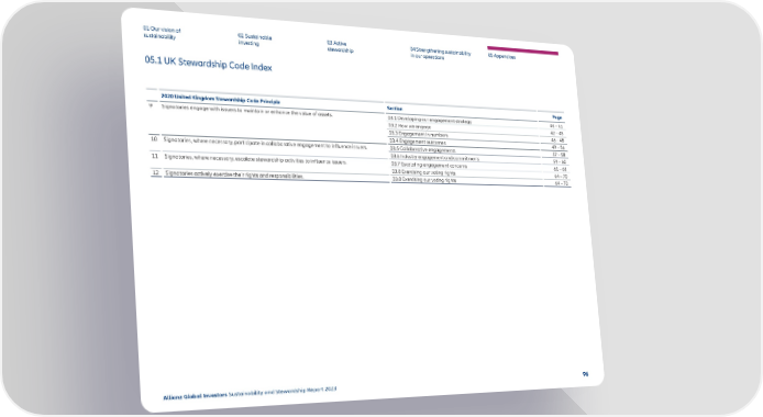 01 Our vision of 02 Sustainable 03 Active 04 Strengthening sustainability 05 Appendices sustainability investing stewardship in our operations 05.1 UK Stewardship Code Index 2020 United Kingdom Stewardship Code Principle Section Page 9 Signatories engage with issuers to maintain or enhance the value of assets. 03.1 Developing our engagement strategy 40 – 41 03.2 How we engage 42 – 45 03.3 Engagement in numbers 46 – 48 03.4 Engagement outcomes 49 – 56 10 Signatories, where necessary, participate in collaborative engagement to in昀氀uence issuers. 03.5 Collaborative engagements 57 – 58 03.6 Industry engagement and commitments 59 – 60 11 Signatories, where necessary, escalate stewardship activities to in昀氀uence issuers. 03.7 Escalating engagement concerns 61 – 63 03.8 Exercising our voting rights 64 – 70 12 Signatories actively exercise their rights and responsibilities. 03.8 Exercising our voting rights 64 – 70 Allianz Global Investors Sustainability and Stewardship Report 2023 96