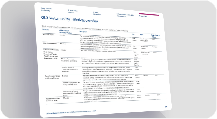 01 Our vision of 02 Sustainable 03 Active 04 Strengthening sustainability 05 Appendices sustainability investing stewardship in our operations 05.3 Sustainability initiatives overview This is an overview of our sustainability initiatives and memberships, demonstrating our active involvement in these initiatives. Initiative Allianz Global Description Date Topics Region/Country Investors‘ Position of Scope 30% Club France Member The purpose of the 30% Club France Investor Group is to engage with SBF120 2021 – Inclusion and France companies on gender diversity to drive systemic change on company boards and present Diversity (I&D) within senior management teams and to develop best practices and recommendations to make SBF120 companies more inclusive, diverse and sustainable. 30% Club Germany Member The purpose of the 30% Club is to engage with companies on gender diversity to drive 2023 – Inclusion and Germany systemic change on company boards and within senior management teams and to present Diversity develop best practices and recommendation. Association Francaise Member AFG is the French Asset Management Industry Association. Since ESG, Corporate France de la Gestion inception Governance 昀椀nanciere (French (1961) – Asset Management present Association – AFG) Member Corporate The Corporate Governance Committee of the AFG aims to promote best governance Since Governance Committee practices in the French marketplace, improve practices at French issuers and discuss inception proxy-related issues, such as the role of proxy advisors and shareholder activism. (1961) – present Member Technical Standing committee organises the working groups, such as the SRI label, the ESR 2019 – Committee Responsible indicators or the energy transition law and others. Committee aims to be a place for present Investment sharing information on current regulations, initiatives and promotion responsible investment. Asian Investor Group Member The Asia Investor Group on Climate Change (AIGCC) is an initiative to create 2018 – Climate Asia on Climate Change awareness among Asia’s asset owners and 昀椀nancial institutions about the risks and present opportunities associated with climate change and low carbon investing. Member Engagement and The work this group undertakes on engagement is complementary and in parallel with 2021 – Policy Working Group company engagement as part of Climate Action 100+. The focus of this working group present will initially enable investors to understand how their increasingly important role in policy advocacy can also help drive more ambitious corporate climate action. Member Paris Aligned The group focuses on developing investor solutions for facilitating the transition to a 2021 – Investment Working Group net-zero emissions economy in Asia and to track global progress. The group oversees present (new) AIGCC’s second annual low carbon investment survey. Access to Nutrition Member ATNI focuses on developing tools and initiatives that track and drive the 2022 – Nutrition Global Initiative – ATNI contribution made by the food and beverage sector to addressing the world’s global present nutrition challenges. Allianz Global Investors Sustainability and Stewardship Report 2023 103