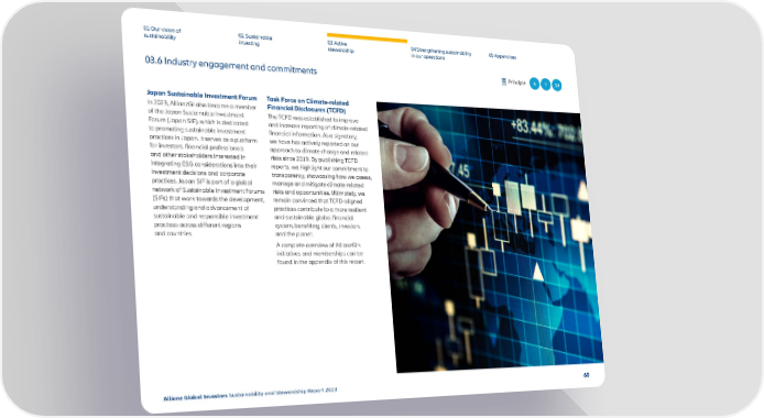 01 Our vision of 02 Sustainable 03 Active 04 Strengthening sustainability 05 Appendices sustainability investing stewardship in our operations 03.6 Industry engagement and commitments Principle 4 7 10 Japan Sustainable Investment Forum Task Force on Climate-related In 2023, AllianzGI also became a member Financial Disclosures (TCFD) of the Japan Sustainable Investment The TCFD was established to improve Forum (Japan SIF), which is dedicated and increase reporting of climate-related to promoting sustainable investment 昀椀nancial information. As a signatory, practices in Japan. It serves as a platform we have has actively reported on our for investors, 昀椀nancial professionals approach to climate change and related and other stakeholders interested in risks since 2019. By publishing TCFD integrating ESG considerations into their reports, we highlight our commitment to investment decisions and corporate transparency, showcasing how we assess, practices. Japan SIF is part of a global manage and mitigate climate-related network of Sustainable Investment Forums risks and opportunities. Ultimately, we (SIFs) that work towards the development, remain convinced that TCFD-aligned understanding and advancement of practices contribute to a more resilient sustainable and responsible investment and sustainable global 昀椀nancial practices across di昀昀erent regions system, bene昀椀ting clients, investors and countries. and the planet. A complete overview of AllianzGI’s initiatives and memberships can be found in the appendix of this report. Allianz Global Investors Sustainability and Stewardship Report 2023 60