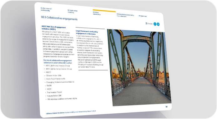 01 Our vision of 02 Sustainable 03 Active 04 Strengthening sustainability 05 Appendices sustainability investing stewardship in our operations 03.5 Collaborative engagements Principle 7 10 IIGCC Net Zero Engagement Initiative (NZEI) Legal framework and policy We joined the IIGCC NZEI to broaden engagement in Germany our reach with respect to our climate In our home market of Germany, engagement activities. The NZEI initiative collaborative engagement is still in extends the scope of engagement targets an emerging state due to a regulatory beyond Climate Action 100+ companies. environment that is not clearly de昀椀ned We supported around 60 letters sent in relation to the implications of jointly with other investors to our portfolio “acting in concert”. This means there companies. In addition, we participated is a certain degree of uncertainty in three engagement groups with other among asset managers and owners investors to challenge companies on their as to the conditions under which they progress towards net-zero targets. may cooperate in engagements. Full list of collaborative engagement We continued policy work to seek initiatives in which AllianzGI is active: clarity on this topic in 2023 via the • 30% Club France Investor Group Ministry of Finance’s Working Group on Sustainable Finance. • 30% Club Germany Investor Group • AIGCC • Climate Action 100+ • Ceres Food Emissions 50 • Emerging Markets Investors Alliance • FAIRR • IIGCC • The Investor Forum • Nature Action 100 • PRI Advance coalition on human rights Allianz Global Investors Sustainability and Stewardship Report 2023 58