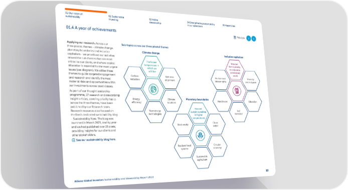 01 Our vision of 02 Sustainable 03 Active 04 Strengthening sustainability 05 Appendices sustainability investing stewardship in our operations 01.4 A year of achievements Principle 2 4 Applying our research. Across our Sub-topics across our three pivotal themes three pivotal themes – climate change, planetary boundaries and inclusive Climate change Inclusive capitalism capitalism – we prioritised our activities around the sub-themes that are most The future How we critical to our clients, and where capital temperature in live equitably allocation is essential for the most urgent which we in a resource issues (see diagram). We utilise these will live constrained world themes to guide targeted engagement Carbon Net-zero Human and Diversity and research and identify the most reduction alignment labour rights and inclusion material risks and opportunities within our investments across asset classes. As part of our thought leadership programme, 17 research and stewardship insight articles, covering priority topics Energy Climate Planetary boundaries Healthcare Education across the three themes, have been e昀케ciency solutions published by our Research team. How we Research resources also focused on New energy sustain ourselves Just the 昀椀rm’s dedicated sustainability blog technologies in higher transition –Sustainability Now. The blog was temperatures launched in March 2023, and by year- Clean end we had published over 25 posts, Biodiversity water providing insights for our clients and other stakeholders. See our sustainability blog here. Resilient food Circular systems economy Sustainable agriculture Allianz Global Investors Sustainability and Stewardship Report 2023 10