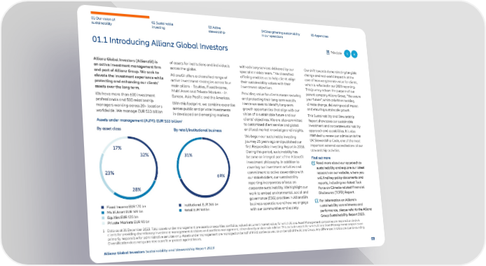 01 Our vision of 02 Sustainable 03 Active 04 Strengthening sustainability 05 Appendices sustainability investing stewardship in our operations 01.1 Introducing Allianz Global Investors Principle 1 6 Allianz Global Investors (AllianzGI) is of assets for institutions and individuals with advisory services delivered by our Our shift towards demonstrating tangible an active investment management 昀椀rm across the globe. specialist risklab team. This diversi昀椀ed change and real-world impact is at the and part of Allianz Group. We seek to AllianzGI o昀昀ers a diversi昀椀ed range of o昀昀ering enables us to help clients align core of how we generate value for clients, elevate the investment experience while active investment strategies across four their sustainability values with their which is re昀氀ected in our 2023 reporting. protecting and enhancing our clients’ main pillars – Equities, Fixed Income, investment objectives. This journey echoes the purpose of our assets over the long term. Multi Asset and Private Markets – in Providing value for clients means securing parent company Allianz Group, “We secure We have more than 600 investment Europe, Asia Paci昀椀c and the Americas. and protecting their long-term wealth. your future”, which prioritises tackling professionals and 500 relationship With this footprint, we combine expertise Hence we seek to identify long-term climate change, delivering social impact managers working across 20+ locations across public and private investments growth opportunities that align with our and ensuring sustainable growth. worldwide. We manage EUR 533 billion in developed and emerging markets vision of a sustainable future and our This Sustainability and Stewardship clients’ objectives. We are also committed Report showcases our sustainable 1 Assets under management (AUM): EUR 533 billion to customised client service and global investment and corporate sustainability By asset class By retail/institutional business and local market knowledge and insights. approach and capabilities. It is also We began our sustainable investing intended to renew our admission to the journey 25 years ago and published our UK Stewardship Code, one of the most 17% 昀椀rst Responsible Investing Report in 2018. important external accreditations of our During this period, sustainability has stewardship activities. 32% 31% become an integral part of the AllianzGI Find out more investment philosophy. In addition to Read more about our approach to covering our investment activities and sustainability and explore our latest 23% 69% commitment to active stewardship with research on our website, where you our stakeholders, our sustainability will 昀椀nd key policy documents and reporting incorporates a focus on reports, including our latest Task 28% corporate sustainability. We highlight our Force on Climate-related Financial work to embed environmental, social and Disclosures (TCFD) Report. governance (ESG) practices in AllianzGI’s Fixed Income EUR 70 bn Institutional EUR bn business operations and how we engage For information on Allianz’s Multi Asset EUR 49 bn Retail EUR bn with our communities and society. sustainability commitments and Equities EUR 25 bn performance, please refer to the Allianz Private Markets EUR 90 bn Group Sustainability Report 2023. 1 Data as at 31 December 2023. Total assets under management are assets or securities portfolios, valued at current market value, for which Allianz Asset Management companies are responsible vis-à-vis clients for providing discretionary investment management decisions and portfolio management, either directly or via a sub-advisor. This excludes assets for which Allianz Asset Management companies are primarily responsible for administrative services only. Assets under management are managed on behalf of third parties as well as on behalf of the Allianz Group. Any di昀昀erences in totals are due to rounding. Diversi昀椀cation does not guarantee a pro昀椀t or protect against losses. Allianz Global Investors Sustainability and Stewardship Report 2023 03