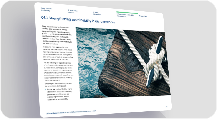 01 Our vision of 02 Sustainable 03 Active 04 Strengthening sustainability 05 Appendices sustainability investing stewardship in our operations 04.1 Strengthening sustainability in our operations Being a sustainable business means creating long-term value without compromising our impact on people, planet or pro昀椀t. We work towards this goal both through the sustainable products and services that we create, and by strengthening sustainability in our own operations. To become more sustainable as a company, we take action in four areas: how we empower our people, how we run our business, how we manage the environmental impact of our operations and how we contribute to society. We are building on a good standard of environmental management across our operations, developing our social approach, strengthening governance with continuously enhanced internal control processes and integrating more sustainability criteria into our supply chain management. This chapter describes the progress we have made during 2023. Please see section 01.3 for more information on our sustainability governance and how we are expanding our more holistic approach to sustainability. Allianz Global Investors Sustainability and Stewardship Report 2023 75