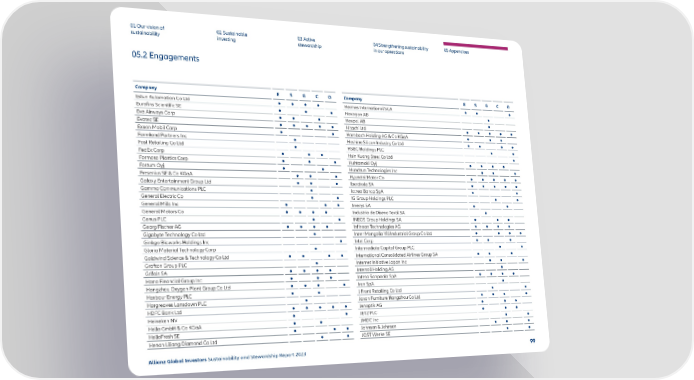 01 Our vision of 02 Sustainable 03 Active 04 Strengthening sustainability 05 Appendices sustainability investing stewardship in our operations 05.2 Engagements Company E S G C O Company E S G C O Estun Automation Co Ltd Hermes International SCA Euro昀椀ns Scienti昀椀c SE Hexagon AB Eva Airways Corp Hexpol AB Evotec SE Hitachi Ltd Exxon Mobil Corp Hornbach Holding AG & Co KGaA Farmland Partners Inc Hoshine Silicon Industry Co Ltd Fast Retailing Co Ltd HSBC Holdings PLC FedEx Corp Hsin Kuang Steel Co Ltd Formosa Plastics Corp Huhtamaki Oyj Fortum Oyj Hundsun Technologies Inc Fresenius SE & Co KGaA Hyundai Motor Co Galaxy Entertainment Group Ltd Iberdrola SA Gamma Communications PLC Iccrea Banca SpA General Electric Co IG Group Holdings PLC General Mills Inc Imerys SA General Motors Co Industria de Diseno Textil SA Genus PLC INEOS Group Holdings SA Georg Fischer AG In昀椀neon Technologies AG Gigabyte Technology Co Ltd Inner Mongolia Yili Industrial Group Co Ltd Ginkgo Bioworks Holdings Inc Intel Corp Gloria Material Technology Corp Intermediate Capital Group PLC Goldwind Science & Technology Co Ltd International Consolidated Airlines Group SA Grafton Group PLC Internet Initiative Japan Inc Grifols SA Interroll Holding AG Hana Financial Group Inc Intesa Sanpaolo SpA Hangzhou Oxygen Plant Group Co Ltd Iren SpA Harbour Energy PLC J Front Retailing Co Ltd Hargreaves Lansdown PLC Jason Furniture Hangzhou Co Ltd HDFC Bank Ltd Jenoptik AG Heineken NV JET2 PLC Hella GmbH & Co KGaA JMDC Inc HelloFresh SE Johnson & Johnson Henan Liliang Diamond Co Ltd JOST Werke SE Allianz Global Investors Sustainability and Stewardship Report 2023 99