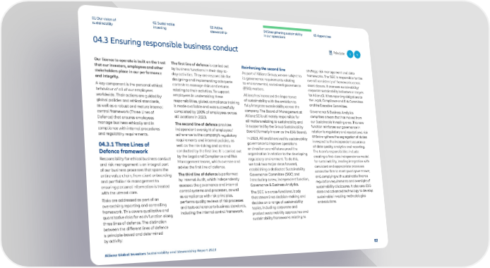 01 Our vision of 02 Sustainable 03 Active 04 Strengthening sustainability 05 Appendices sustainability investing stewardship in our operations 04.3 Ensuring responsible business conduct Principle 3 5 Our licence to operate is built on the trust The 昀椀rst line of defence is carried out Reinforcing the second line strategy, risk management and data that our investors, employees and other by business functions in their day-to- As part of Allianz Group, we are subject to frameworks. The SGC is responsible for the stakeholders place in our performance day activities. They are responsible for its governance requirements relating overall consistency of frameworks across and integrity. designing and implementing adequate to environmental, social and governance asset classes. It oversees sustainability/ A key component is the personal ethical controls to manage risks and returns (ESG) matters. corporate sustainability indicators as targets behaviour of all of our employees relating to their activities. To support Allianz has increased the importance for AllianzGI. It has reporting obligations to worldwide. Their actions are guided by employees in undertaking these of sustainability with the ambition to the Legal, Compliance and Risk Committee global policies and ethical standards, responsibilities, global compliance training fully integrate sustainability across the and the Executive Committee. as well as a robust and mature internal is made available and was successfully company. The Board of Management at Governance & Business Analytics control framework (Three Lines of completed by 100% of employees across Allianz SE is ultimately responsible for comprises a team that has moved from Defence) that ensures employees all locations in 2023. all matters relating to sustainability and our Sustainable Investing area. This new manage business ethically and in The second line of defence provides is supported by the Group Sustainability function reinforces our governance in compliance with internal procedures independent oversight of employees’ Board (formerly known as the ESG Board). relation to regulatory and reputational risk and regulatory requirements. adherence to the company’s regulatory In 2023, AllianzGI evolved its sustainability and strengthens the segregation of duties requirements and internal policies, as governance to improve operations in respect to the independent assurance 04.3.1 Three Lines of well as the risk-taking and controls and resilience and future-proof the of data quality, analytics and reporting. Defence framework conducted by the 昀椀rst line. It is carried out organisation in relation to the developing The team’s responsibilities include: Responsibility for ethical business conduct by the Legal and Compliance and Risk regulatory environment. To do this, creating a 昀椀rst-class independence model and risk management is an integral part Management teams, which oversee and we took two major steps forward, for sustainability; leading integration with of our business processes that spans the advise the 昀椀rst line of defence. establishing a dedicated Sustainability consistent and appropriate processes entire value chain, from client onboarding The third line of defence is performed Governance Committee (SGC) and across the 昀椀rm to meet good governance; and portfolio risk management to by Internal Audit, which independently introducing a new, independent function, and complying with sustainable 昀椀nance ensuring personal information is treated assesses the governance and internal Governance & Business Analytics. regulation requirements and oversight of with the utmost care. control systems and processes, as well sustainability disclosures. It also uses ESG as compliance with risk principles, The SGC is a cross-functional body data and advanced technology to develop Risks are addressed as part of an performs quality reviews of risk processes that streamlines decision-making and sustainable investing methodologies overarching reporting and controlling and tests adherence to business standards, decides on a range of sustainability and solutions. framework. This covers qualitative and including the internal control framework. topics, including corporate and quantitative risks for each function along product sustainability approaches and three lines of defence. The distinction sustainability frameworks relating to between the di昀昀erent lines of defence is principle-based and determined by activity: Allianz Global Investors Sustainability and Stewardship Report 2023 82