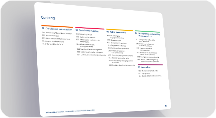 Contents 01 Our vision of sustainability 02 Sustainable investing 03 Active stewardship 04 Str engthening sustainability 01.1 Introducing Allianz Global Investors 02.1 Delivering change 03.1 Developing our in our operations 01.2 About this report 02.2 Sustainability research engagement strategy 04.1 Strengthening sustainability 01.3 What sustainability means to us 02.3 Sustainability methodologies 03.2 How we engage in our operations 01.4 A year of achievements and analytics 03.3 Engagement in numbers 04.2 Creating an inclusive and 01.5 Our ambition for 2024 02.4 Climate-related risks 03.4 Engagement outcomes supportive workplace and opportunities 03.5 Collaborative engagements 04.3 Ensuring responsible 02.5 Sustainability risk management 03.6 Industry engagement business conduct 02.6 Sustainable investing categories and commitments 04.4 Managing the environmental 02.7 Looking ahead: sustainable investing 03.7 Escalating engagement concerns impact of our operations 03.8 Exercising our voting rights 04.5 Driving our corporate citizenship 03.9 Transparently managing con昀氀icts 04.6 Looking ahead: strengthening of interest sustainability in our operations 03.10 Looking ahead: active stewardship 05 Appendices 05.1 UK Stewardship Code index 05.2 Engagements 05.3 Sustainability initiatives overview Allianz Global Investors Sustainability and Stewardship Report 2023 01