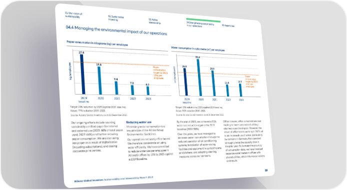 01 Our vision of 02 Sustainable 03 Active 04 Strengthening sustainability 05 Appendices sustainability investing stewardship in our operations 04.4 Managing the environmental impact of our operations 3 Paper consumption in kilograms (kg) per employee Water consumption in cubic metre (m ) per employee 27.4 35.4 19.4 Paper 26.0 24.9 consumption target by 2025: Water 22kg per consumption 9.4 employee 3/employee 12.7 target by 2025: kg/employee m 11.4 3 7.0 22m per 6.3 employee 2019 2020 2021 2022 2023 2019 2020 2021 2022 2023 baseline baseline Target: 20% reduction by 2025 (against 2019 baseline). Target: 15% reduction by 2025 (against 2019 baseline). Actual: 77% reduction 2019–2023. Actual: 51% reduction 2019–2023. Source: Allianz Global Investors, as at 31 December 2023. Source: Allianz Global Investors, as at 31 December 2023. Our ongoing e昀昀orts include sourcing Reducing water use By the end of 2023, we achieved a 51% O昀케ce closures, o昀케ce consolidations and sustainably certi昀椀ed paper for internal Minimising water consumption is a water use reduction against the 2019 moving to more sustainable buildings and external use (2023: 68% of total paper key principle of the Allianz Group baseline (2022: 56%). also had a positive impact. However, the used; 2022: 66%) and further reducing Environmental Guidelines. Over the years, we have managed to return of o昀케ce-based working in 2023 led paper consumption. We are also using Our operations are solely o昀케ce-based. decrease water consumption through the to an increased use of water, particularly less paper as a result of digitalisation We therefore concentrate on using reduced operation of air-conditioning by canteens in Germany that operated (including subscriptions), and closing water e昀케ciently. We have committed systems, installation of water-saving at roughly twice the capacity than in corporate print centres. to reduce water use per employee in facilities and equipment in our bathrooms the prior year. To increase the accuracy AllianzGI o昀케ces by 15% by 2025 against and kitchens, and adapting cleaning of consumption data, we have installed a 2019 baseline. measures across our canteens. separate water meters in o昀케ces with shared utilities, which informs our actions and results. Allianz Global Investors Sustainability and Stewardship Report 2023 89