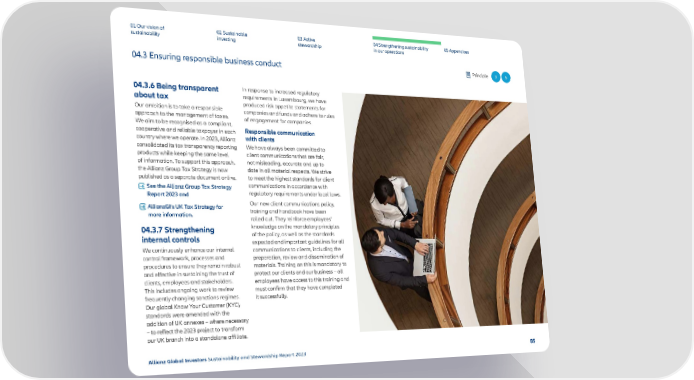 01 Our vision of 02 Sustainable 03 Active 04 Strengthening sustainability 05 Appendices sustainability investing stewardship in our operations 04.3 Ensuring responsible business conduct Principle 3 5 04.3.6 Being transparent In response to increased regulatory about tax requirements in Luxembourg, we have Our ambition is to take a responsible produced risk appetite statements for approach to the management of taxes. companies and funds and adhere to rules We aim to be recognised as a compliant, of engagement for companies. cooperative and reliable taxpayer in each Responsible communication country where we operate. In 2023, Allianz with clients consolidated its tax transparency reporting We have always been committed to products while keeping the same level client communications that are fair, of information. To support this approach, not misleading, accurate and up to the Allianz Group Tax Strategy is now date in all material respects. We strive published as a separate document online. to meet the highest standards for client See the Allianz Group Tax Strategy communications in accordance with Report 2023 and regulatory requirements under local laws. AllianzGI’s UK Tax Strategy for Our new client communications policy, more information. training and handbook have been rolled out. They reinforce employees’ 04.3.7 Strengthening knowledge on the mandatory principles internal controls of the policy, as well as the standards expected and important guidelines for all We continuously enhance our internal communications to clients, including the control framework, processes and preparation, review and dissemination of procedures to ensure they remain robust materials. Training on this is mandatory to and e昀昀ective in sustaining the trust of protect our clients and our business – all clients, employees and stakeholders. employees have access to this training and This includes ongoing work to review must con昀椀rm that they have completed frequently changing sanctions regimes. it successfully. Our global Know Your Customer (KYC) standards were amended with the addition of UK annexes – where necessary –to re昀氀ect the 2023 project to transform our UK branch into a standalone a昀케liate. Allianz Global Investors Sustainability and Stewardship Report 2023 85