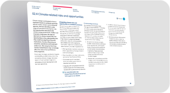 01 Our vision of 02 Sustainable 03 Active 04 Strengthening sustainability 05 Appendices sustainability investing stewardship in our operations 02.4 Climate-related risks and opportunities Principle 4 Climate change is anticipated to have a Integrating climate risks and Climate strategy and clients 3. In addition, risklab’ s Climate Navigator signi昀椀cant impact on worldwide economies opportunities in investment processes As a member of the Net Zero Asset provides a forward-looking approach and the various areas in which AllianzGI We continue to build our expertise in Managers initiative (NZAMi), in managing for measuring the impact on expected operates. We have identi昀椀ed a wide identifying, de昀椀ning and measuring our clients’ assets, we are shaping the future asset class returns, based on range of transitional and physical risks these climate-related opportunities pathway towards net-zero GHG emissions macro as well as company-speci昀椀c and opportunities associated with and risks. This is critical to our ability to by 2050 in line with global e昀昀orts to limit changes across NGFS climate climate change across short, medium and help guide our clients on the possible warming to 1.5°C as outlined in the Paris change scenarios. long-term timeframes. We base our 30 outcomes of individual investments, Agreement. In so doing, we enable 4. W e develop tailored climate-related approach to climate-related risks and portfolios or even broader asset classes. our clients to re昀氀ect climate risks and investment solutions, answering opportunities on the understanding that A high level of connectivity between opportunities in their holdings: speci昀椀c institutional client needs to they could have signi昀椀cant 昀椀nancial policy, data, research and stewardship, 1. A longside mainstream strategies, align their portfolios while considering implications, thereby in昀氀uencing our and collaboration with Investments, we o昀昀er climate thematic and impact- coal exclusions, transition exposure corporate, operational and investment Distribution, Legal and Compliance and driven opportunities, such as green and/or emissions reduction. endeavours. We recognise that these other functions, provides the platform for: bonds, climate transition equity and climate-related factors may increasingly • Offering climate investment solutions to private markets renewable energy a昀昀ect the value of our portfolios as clients supported by thorough research investments. These specialised time progresses. and methodologies. assets can help to align an asset As an asset manager, we deeply integrate • Ensuring policies are robust and current, owner’s portfolio with climate sustainability considerations, especially such as our Coal Exclusion Policy. transition targets. concerning climate change, into every 2. Risklab o昀昀 ers comprehensive portfolio aspect of our investment approach, • Collaborating with investment analyses, which include GHG emissions, processes, product development and teams and asset owner clients to transition scores, physical risks, implied business operations. decarbonise portfolios. temperature rise and exposure to • Engaging with companies to establish fossil fuels. interim targets and facilitate progress towards driving real economy transition. For more information see: Climate Policy Framework and annual TCFD report on our website. 30 Source: United Nations Climate Change, The Paris Agreement, December 2015. Allianz Global Investors Sustainability and Stewardship Report 2023 28