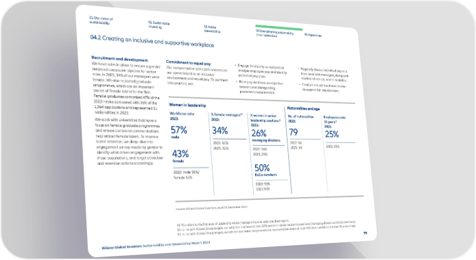 01 Our vision of 02 Sustainable 03 Active 04 Strengthening sustainability 05 Appendices sustainability investing stewardship in our operations 04.2 Creating an inclusive and supportive workplace Recruitment and development Commitment to equal pay • Engage third party consultants to • Regularly discuss individual pay at a We have rules in place to ensure a gender- Our compensation principles underscore analyse employee pay and identify local level with managers, along with balanced succession pipeline for senior our commitment to an inclusive potential pay gaps. market references, where available. roles. In 2023, 34% of our managers were environment and equal pay. To put them • Base pay decisions on objective • Conduct annual functional reviews female. We also restarted graduate into practice, we: reasons and disregarding to support fair pay decisions. programmes, which are an important protected characteristics. source of female talent for the 昀椀rm. Female graduates comprised 47% of the 2023 intake compared with 36% of the Women in leadership Nationalities and age 1,364 applications and represented 11 Workforce ratio 49 nationalities in 2023. % female managers % women in senior No. of nationalities Employees under 2023: 50 51 We work with universities that have a 2023: leadership positions 2023: 35 years focus on female graduate programmes 2023: 2023: and ensure our brand communications 57% 34% 26% 79 25% help attract female talent. To improve male managing directors talent retention, we deep-dive into 2022: 32% 2022: 66 engagement survey results by gender to 2021: 32% 2022: 26% 2021: 63 2022: 25% identify what drives engagement with 43% 2021: 23% those populations, and target attraction female and retention actions accordingly. 50% 2022: male 58%/ female 42% ExCo members 2022: 50% 2021:50% Source: Allianz Global Investors, as at 31 December 2023. 49 This refers to the 昀椀rst level of leadership where managers have at least one direct report. 50 In line with Allianz Group targets, our ambition is to have at least 30% women in senior leadership positions (managing directors and ExCo members). 51 In line with Allianz Group targets, we aim to have balanced generational representation where at least 25% of our workforce is below 35 years of age. Allianz Global Investors Sustainability and Stewardship Report 2023 79