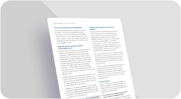 Access to healthcare - more important than ever The link to Climate and Planetary Boundaries The role of pharmaceuticals and the funding of There is a real risk that climate change and reduced healthcare biodiversity could worsen the problem. Emissions According to the OECD, pharmaceuticals are the third and pollution could raise the incidence of respiratory largest healthcare expenditure item after in-patient diseases, heavy rains and higher temperatures could and out-patient care, accounting for 16% of average raise occurrence of fevers (e.g. Dengue, West Nile), while health spend, even before including in-hospital 17 challenges to food availability and affordability could pharmaceuticals costs . These are costs predominantly impact healthy nutrition. covered by government financing or compulsory insurance schemes. However, the WHO estimates that Healthcare costs are escalating quickly as over 800 million people are spending over 10% of multimorbidity worsens household budgets on health for themselves, a sick child Historically there has been a focus on the link between or family member – these can result in “catastrophic 18 health and mortality, but there is now a heightened expenses” that can lead to severe poverty. awareness of multimorbidity which is defined as the The situation is particularly acute for innovative remedies presence of two or more long-term health conditions. and solutions. A survey by our Grassroots Research® team Multimorbidity is a major contribution of the sustained showed around 40% of US diabetes educators surveyed increase in healthcare costs as a share of GDP in OECD highlighted that new oral (not injected) diabetes drug countries. Among OECD Member countries, the United were very attractive but could be prohibitively expensive States has the highest percentage of GDP spent on without insurance. healthcare – 16.8% in 2020. For context, US Military expenditure was 3.7% of GDP in the same year. While The UK is an example of where private health insurance lower than US, the figures for UK, France and Germany are is not standard due to its broad and free access to 14 still above 12%. healthcare. However, the UK Healthcare system is While life expectancy has risen in recent decades, this has underfunded, preventing every new therapy being not been aligned to higher life quality or health, but an supported and a divide has developed where those with ability to address or delay terminal disease. Age is a driver better financial means can go externally for better or of health spending which is partly due to the prevalence quicker treatment. 15 of multimorbidity also rising with age. Investing in Health A combination of an ageing population and an increase Investors could play a critical role by contributing in long-term conditions means multimorbidity is set to rise. to Inclusive Capitalism via investing in health. In the Costs increase significantly with each additional condition US alone health spending is projected to grow at an and a near exponential relationship between the number average annual rate of 5.4 percent for 2019-28 and to 16 19 of conditions and costs will play out. reach USD 6.2 trillion by 2028. Healthcare and military expenditure as a percentage 1. For investors there are potential opportunities to invest in health via the following themes: 18.0% – Biotechnology and Pharmaceutical companies could 16.0% provide innovative drugs to treat diseases like diabetes, 14.0% HIV and heart diseases for example to improve life 12.0% quality and life expectancy 10.0% – Medical technology with companies providing 8.0% pacemakers, stents or dental implants 6.0% – Health tech and data driven solutions with examples 4.0% being telemedicine to contact doctors via a video 2.0% conference or apps to address diseases like obesity and depression; digital tools are able to serve a greater 0.0% number of patients more effectively and at lower cost FranceSweden anada Korea ssia – High-quality and affordable nutrition with low fat and Germany enmar sugar United States Netherlands – Solutions to provide education on health and well- United Kingdom being to a broad population ealthcare ilitary of GDP in select countries worldwide in 2020 2. Materiality of non-financial information For investors seeking unconstrained universes, it will be Source: Healthcare vs military expenditure comparison select countries important to identify evolving material ESG risks relating to 2020 | Statista 3