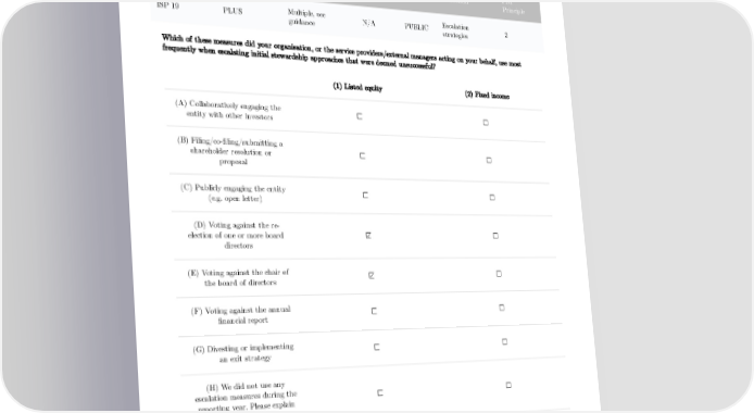 Escalation strategies Type of Gateway PRI Indicator Dependent on Disclosure Subsection indicator to Principle Multiple, see Escalation ISP 19 PLUS N/A PUBLIC 2 guidance strategies Which of these measures did your organisation, or the service providers/external managers acting on your behalf, use most frequently when escalating initial stewardship approaches that were deemed unsuccessful? (1) Listed equity (2) Fixed income (A) Collaboratively engaging the ☐ ☐ entity with other investors (B) Filing/co-filing/submitting a shareholder resolution or ☐ ☐ proposal (C) Publicly engaging the entity ☐ ☐ (e.g. open letter) (D) Voting against the re- election of one or more board ☑ ☐ directors (E) Voting against the chair of ☑ ☐ the board of directors (F) Voting against the annual ☐ ☐ financial report (G) Divesting or implementing ☐ ☐ an exit strategy (H) We did not use any escalation measures during the ☐ ☐ reporting year. Please explain why below 50