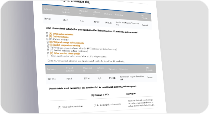 (7) Interim targets or KPIs used to (8) Other details assess progress against the target (E) Other target [as specified] - - Metrics and targets: Transition risk Type of Dependent Gateway PRI Indicator Disclosure Subsection indicator on to Principle Metrics and targets: Transition ISP 38 PLUS N/A ISP 38.1 PUBLIC General risk What climate-related metric(s) has your organisation identified for transition risk monitoring and management? ☑ (A) Total carbon emissions ☑ (B) Carbon footprint ☐ (C) Carbon intensity ☑ (D) Weighted average carbon intensity ☑ (E) Implied temperature warming ☐ (F) Percentage of assets aligned with the EU Taxonomy (or similar taxonomy) ☐ (G) Avoided emissions metrics (real assets) ☑ (H) Other metrics, please specify: Sector-specific carbon budget above/below a 1.5/2/3 degree scenario ☐ (I) No, we have not identified any climate-related metrics for transition risk monitoring Type of Dependent Gateway PRI Indicator Disclosure Subsection indicator on to Principle Metrics and targets: Transition ISP 38.1 PLUS ISP 38 N/A PUBLIC General risk Provide details about the metric(s) you have identified for transition risk monitoring and management. (1) Coverage of AUM (2) Purpose Measures the total greenhouse gas (A) Total carbon emissions (2) for the majority of our assets footprint of a portfolio in tons of carbon-dioxide equivalents (tCO2e). 68