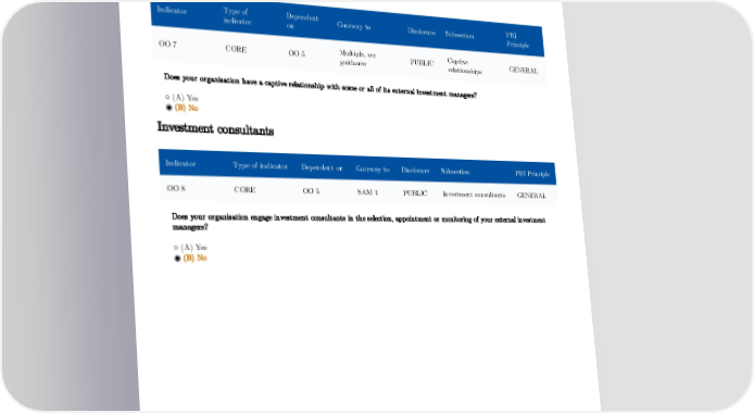 Externally managed assets Captive relationships Type of Dependent PRI Indicator Gateway to Disclosure Subsection indicator on Principle Multiple, see Captive OO 7 CORE OO 5 PUBLIC GENERAL guidance relationships Does your organisation have a captive relationship with some or all of its external investment managers? ○ (A) Yes ◉ (B) No Investment consultants Indicator Type of indicator Dependent on Gateway to Disclosure Subsection PRI Principle OO 8 CORE OO 5 SAM 1 PUBLIC Investment consultants GENERAL Does your organisation engage investment consultants in the selection, appointment or monitoring of your external investment managers? ○ (A) Yes ◉ (B) No 18