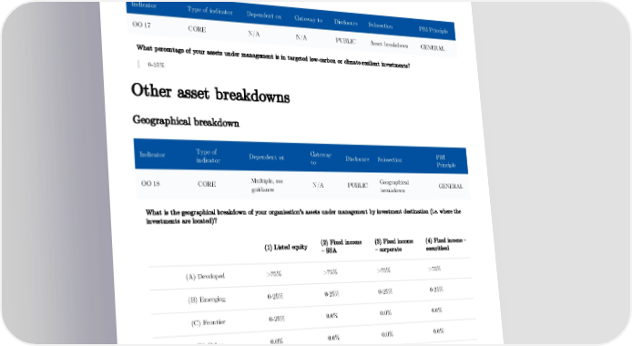 Climate investments Asset breakdown Indicator Type of indicator Dependent on Gateway to Disclosure Subsection PRI Principle OO 17 CORE N/A N/A PUBLIC Asset breakdown GENERAL What percentage of your assets under management is in targeted low-carbon or climate-resilient investments? 0-25% Other asset breakdowns Geographical breakdown Type of Gateway PRI Indicator Dependent on Disclosure Subsection indicator to Principle Multiple, see Geographical OO 18 CORE N/A PUBLIC GENERAL guidance breakdown What is the geographical breakdown of your organisation's assets under management by investment destination (i.e. where the investments are located)? (2) Fixed income (3) Fixed income (4) Fixed income – (1) Listed equity – SSA – corporate securitised (A) Developed >75% >75% >75% >75% (B) Emerging 0-25% 0-25% 0-25% 0-25% (C) Frontier 0-25% 0.0% 0.0% 0.0% (D) Other 0.0% 0.0% 0.0% 0.0% 28