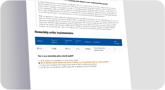 Indicator Type of indicator Dependent on Gateway to Disclosure Subsection PRI Principle ISP 12.1 PLUS ISP 12 N/A PUBLIC Stewardship policy 2 Describe any additional details related to your stewardship policy elements or your overall stewardship approach. At Allianz Global Investors, our responsibility and fiduciary duty to be an active steward of our clients’ assets is taken very seriously. Our Stewardship Statement covers our principles in discharing our stewardship responsibilities, managing conflicts of interests, how we monitor investee companies, our engagement activities (e.g. providing feedback, challenging corporate practices / seeking change, and in rare circumstances, public interventions, escalation of stewardship activities, collaboration with other investors, and our approach to Proxy Voting including disclosure and reporting of voting activities. For further information, please refer to our Stewardship Statement via the following link: https://www.allianzgi.com/en/our-firm/esg/documents#keypolicydocumentsandreports While our approach to climate related-risks and opportunities is not specifically mentioned in our Stewardship Statement, this is covered under our Global Corporate Governance Guidelines. Climate-related risks can have material impact on companies’ business models and operations and AllianzGI therefore expects boards and management of all companies to assess and report on the impact of climate- related risks. AllianzGI supports shareholder proposals seeking information on climate related risks and normally support proposals calling for the reduction and disclosure of GHG emissions. Details can be found in our Global Corporate Governance Guidelines document via the following link: https://www.allianzgi.com/en/our-firm/esg/documents#keypolicydocumentsandreports Stewardship policy implementation Type of Dependent Gateway PRI Indicator Disclosure Subsection indicator on to Principle Stewardship policy ISP 13 CORE ISP 1.1 N/A PUBLIC 2 implementation How is your stewardship policy primarily applied? ○ (A) It requires our organisation to take certain actions ◉ (B) It describes default actions that can be overridden (e.g. by investment teams for certain portfolios) ○ (C) It creates permission for taking certain measures that are otherwise exceptional ○ (D) We have not developed a uniform approach to applying our stewardship policy 46