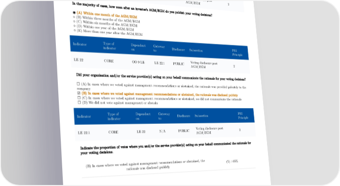 Type of Dependent Gateway PRI Indicator Disclosure Subsection indicator on to Principle Voting disclosure post LE 21.1 CORE LE 21 N/A PUBLIC 2 AGM/EGM In the majority of cases, how soon after an investee's AGM/EGM do you publish your voting decisions? ◉ (A) Within one month of the AGM/EGM ○ (B) Within three months of the AGM/EGM ○ (C) Within six months of the AGM/EGM ○ (D) Within one year of the AGM/EGM ○ (E) More than one year after the AGM/EGM Type of Dependent Gateway PRI Indicator Disclosure Subsection indicator on to Principle Voting disclosure post LE 22 CORE OO 9 LE LE 22.1 PUBLIC 2 AGM/EGM Did your organisation and/or the service provider(s) acting on your behalf communicate the rationale for your voting decisions? ☐ (A) In cases where we voted against management recommendations or abstained, the rationale was provided privately to the company ☑ (B) In cases where we voted against management recommendations or abstained, the rationale was disclosed publicly ☐ (C) In cases where we voted against management recommendations or abstained, we did not communicate the rationale ☐ (D) We did not vote against management or abstain Type of Dependent Gateway PRI Indicator Disclosure Subsection indicator on to Principle Voting disclosure post LE 22.1 CORE LE 22 N/A PUBLIC 2 AGM/EGM Indicate the proportion of votes where you and/or the service provider(s) acting on your behalf communicated the rationale for your voting decisions. (B) In cases where we voted against management recommendations or abstained, the (5) >95% rationale was disclosed publicly 117