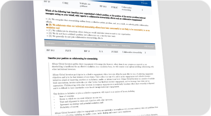 Collaborative stewardship Type of Gateway PRI Indicator Dependent on Disclosure Subsection indicator to Principle Multiple, see Collaborative ISP 18 CORE ISP 18.1 PUBLIC 2 guidance stewardship Which of the following best describes your organisation's default position, or the position of the service providers/external managers acting on your behalf, with regards to collaborative stewardship efforts such as collaborative engagements? ○ (A) We recognise that stewardship suffers from a collective action problem, and, as a result, we actively prefer collaborative efforts ◉ (B) We collaborate when our individual stewardship efforts have been unsuccessful or are likely to be unsuccessful, i.e. as an escalation tool ○ (C) We collaborate in situations where doing so would minimise resource cost to our organisation ○ (D) We do not have a default position but collaborate on a case-by-case basis ○ (E) We generally do not join collaborative stewardship efforts Indicator Type of indicator Dependent on Gateway to Disclosure Subsection PRI Principle ISP 18.1 PLUS ISP 18 N/A PUBLIC Collaborative stewardship 2 Describe your position on collaborating for stewardship. Allianz Global Investors prefers direct engagement with companies, however, where these do not progress as expected or our shareholding is insufficient for an effective escalation on a standalone basis, we will consider other options including collaborating with other institutional investors. Allianz Global Investors participates in collective engagement when this route offers the most effective way of achieving engagement objectives and is in the best interests of our clients. This is often the case with public policy engagements and collective investor initiatives aimed at improving practices at an industry, market or international level. Allianz Global Investors is a member of multiple trade associations, investor networks and other bodies that facilitate investor engagement, and we leverage these when and as appropriate. Collaborating with other investors in company engagements is particularly important where share ownership is dispersed and it is difficult to have shareholder voice heard through individual engagements. Our decision to initiative or join a collective engagement will depend on a number of factors, including: - Issue of concerns; - Extent to which we can exert influence on our own; - Trust and alignment in views and objectives with other investors; - Agreement on strategy and potential escalation; and - Probability of success. Allianz Global Investors’ collective engagement activies are undertaken in compliance with relevant statutory rules and guidelines from regulatory authorities, including on market abuse, insider dealing and concert party regulations. At any given time, Allianz Global Investors may be actively involved in several investor bodies and projects that facilitate discussion, sharing of information and collective engagement at an issuer or public policy level. 49
