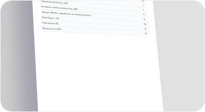 Table of Contents Module/Indicator Page Senior Leadership Statement (SLS) 4 Organisational Overview (OO) 8 Investment and Stewardship Policy (ISP) 37 Manager Selection, Appointment and Monitoring (SAM) 84 Listed Equity (LE) 102 Fixed Income (FI) 120 Infrastructure (INF) 137 3