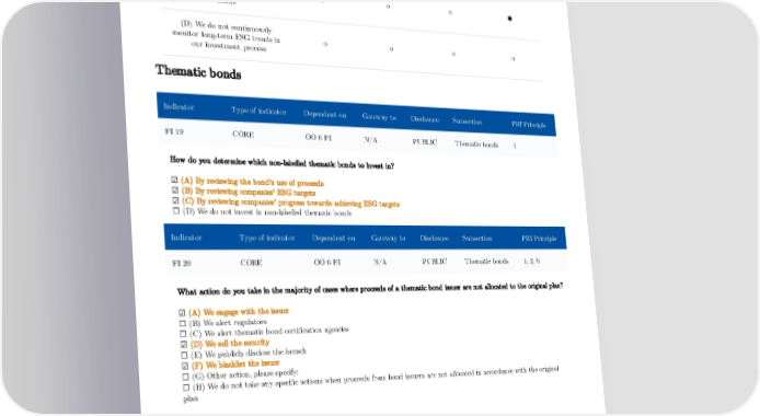 (B) We monitor long-term ESG trends for the majority of our ◉ ◉ ◉ ○ assets (C) We monitor long-term ESG trends for a minority of our ○ ○ ○ ◉ assets (D) We do not continuously monitor long-term ESG trends in ○ ○ ○ ○ our investment process Thematic bonds Indicator Type of indicator Dependent on Gateway to Disclosure Subsection PRI Principle FI 19 CORE OO 6 FI N/A PUBLIC Thematic bonds 1 How do you determine which non-labelled thematic bonds to invest in? ☑ (A) By reviewing the bond's use of proceeds ☑ (B) By reviewing companies' ESG targets ☑ (C) By reviewing companies' progress towards achieving ESG targets ☐ (D) We do not invest in non-labelled thematic bonds Indicator Type of indicator Dependent on Gateway to Disclosure Subsection PRI Principle FI 20 CORE OO 6 FI N/A PUBLIC Thematic bonds 1, 2, 6 What action do you take in the majority of cases where proceeds of a thematic bond issuer are not allocated to the original plan? ☑ (A) We engage with the issuer ☐ (B) We alert regulators ☐ (C) We alert thematic bond certification agencies ☑ (D) We sell the security ☐ (E) We publicly disclose the breach ☑ (F) We blacklist the issuer ☐ (G) Other action, please specify: ☐ (H) We do not take any specific actions when proceeds from bond issuers are not allocated in accordance with the original plan 133