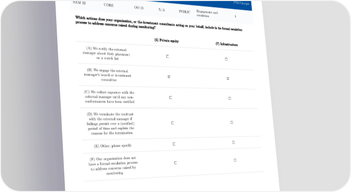 Engagement and escalation Type of Dependent Gateway Indicator Disclosure Subsection PRI Principle indicator on to Engagement and SAM 22 CORE OO 13 N/A PUBLIC 1 escalation Which actions does your organisation, or the investment consultants acting on your behalf, include in its formal escalation process to address concerns raised during monitoring? (5) Private equity (7) Infrastructure (A) We notify the external manager about their placement ☐ ☐ on a watch list (B) We engage the external manager's board or investment ☑ ☑ committee (C) We reduce exposure with the external manager until any non- ☐ ☐ conformances have been rectified (D) We terminate the contract with the external manager if failings persist over a (notified) ☐ ☐ period of time and explain the reasons for the termination (E) Other, please specify ☐ ☐ (F) Our organisation does not have a formal escalation process ☐ ☐ to address concerns raised by monitoring 100
