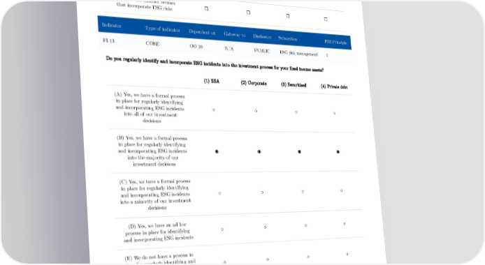 (D) We do not conduct regular reviews. Risk reviews of ESG factors are conducted at the ☐ ☐ ☐ ☐ discretion of the individual fund manager and vary in frequency (E) We do not conduct reviews ☐ ☐ ☐ ☐ that incorporate ESG risks Indicator Type of indicator Dependent on Gateway to Disclosure Subsection PRI Principle FI 13 CORE OO 10 N/A PUBLIC ESG risk management 1 Do you regularly identify and incorporate ESG incidents into the investment process for your fixed income assets? (1) SSA (2) Corporate (3) Securitised (4) Private debt (A) Yes, we have a formal process in place for regularly identifying and incorporating ESG incidents ○ ○ ○ ○ into all of our investment decisions (B) Yes, we have a formal process in place for regularly identifying and incorporating ESG incidents ◉ ◉ ◉ ◉ into the majority of our investment decisions (C) Yes, we have a formal process in place for regularly identifying and incorporating ESG incidents ○ ○ ○ ○ into a minority of our investment decisions (D) Yes, we have an ad hoc process in place for identifying ○ ○ ○ ○ and incorporating ESG incidents (E) We do not have a process in place for regularly identifying and ○ ○ ○ ○ incorporating ESG incidents into our investment decision-making 131