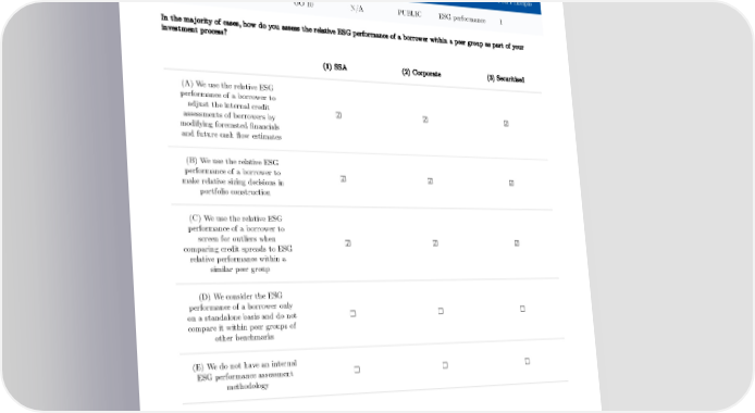 ESG performance Indicator Type of indicator Dependent on Gateway to Disclosure Subsection PRI Principle FI 8 CORE OO 10 N/A PUBLIC ESG performance 1 In the majority of cases, how do you assess the relative ESG performance of a borrower within a peer group as part of your investment process? (1) SSA (2) Corporate (3) Securitised (A) We use the relative ESG performance of a borrower to adjust the internal credit ☑ ☑ ☑ assessments of borrowers by modifying forecasted financials and future cash flow estimates (B) We use the relative ESG performance of a borrower to ☑ ☑ ☑ make relative sizing decisions in portfolio construction (C) We use the relative ESG performance of a borrower to screen for outliers when ☑ ☑ ☑ comparing credit spreads to ESG relative performance within a similar peer group (D) We consider the ESG performance of a borrower only on a standalone basis and do not ☐ ☐ ☐ compare it within peer groups of other benchmarks (E) We do not have an internal ESG performance assessment ☐ ☐ ☐ methodology 127