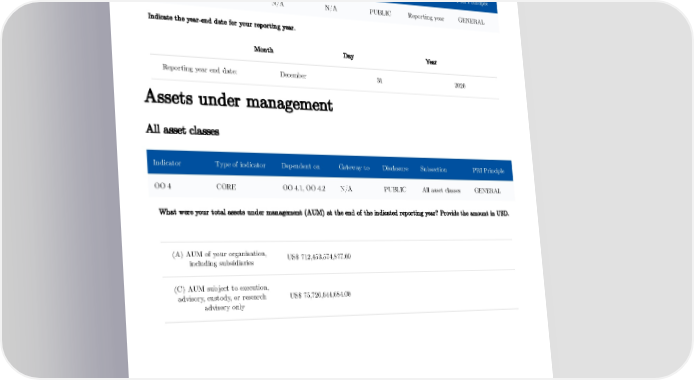 Reporting year Indicator Type of indicator Dependent on Gateway to Disclosure Subsection PRI Principle OO 3 CORE N/A N/A PUBLIC Reporting year GENERAL Indicate the year-end date for your reporting year. Month Day Year Reporting year end date: December 31 2020 Assets under management All asset classes Indicator Type of indicator Dependent on Gateway to Disclosure Subsection PRI Principle OO 4 CORE OO 4.1, OO 4.2 N/A PUBLIC All asset classes GENERAL What were your total assets under management (AUM) at the end of the indicated reporting year? Provide the amount in USD. (A) AUM of your organisation, US$ 712,453,574,877.00 including subsidiaries (C) AUM subject to execution, advisory, custody, or research US$ 75,720,644,684.00 advisory only 8